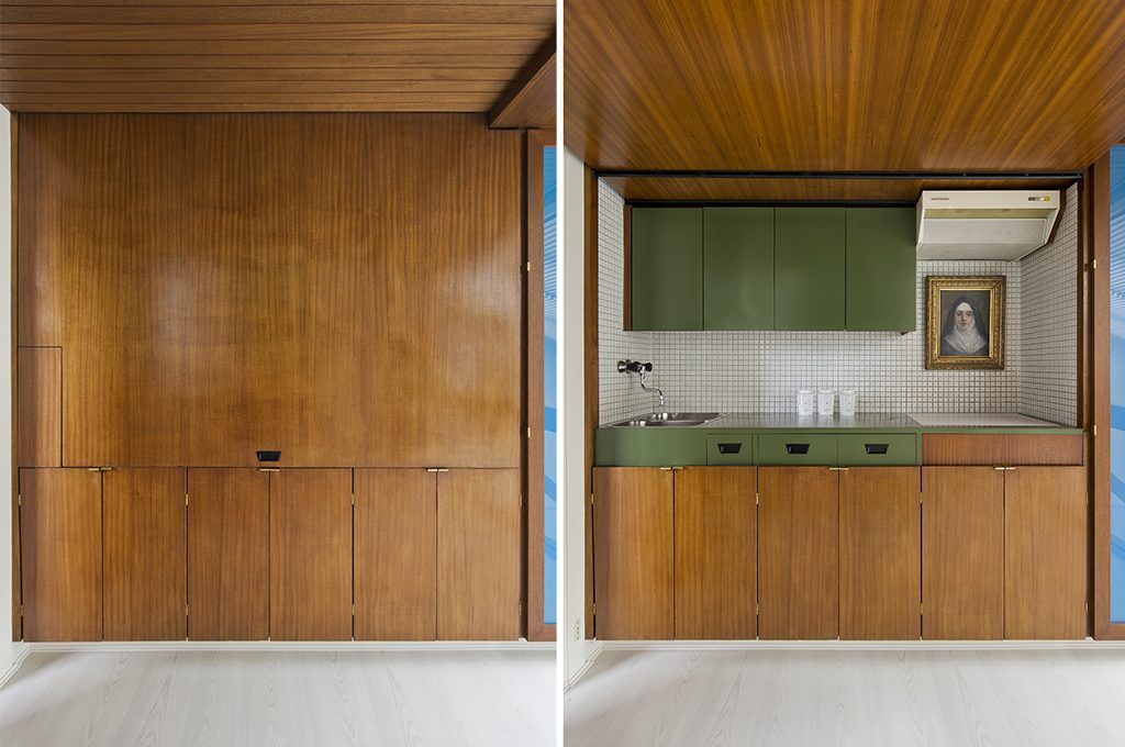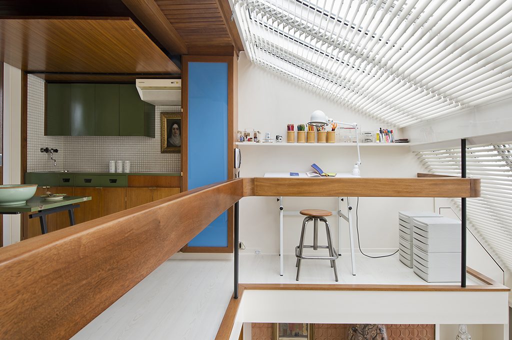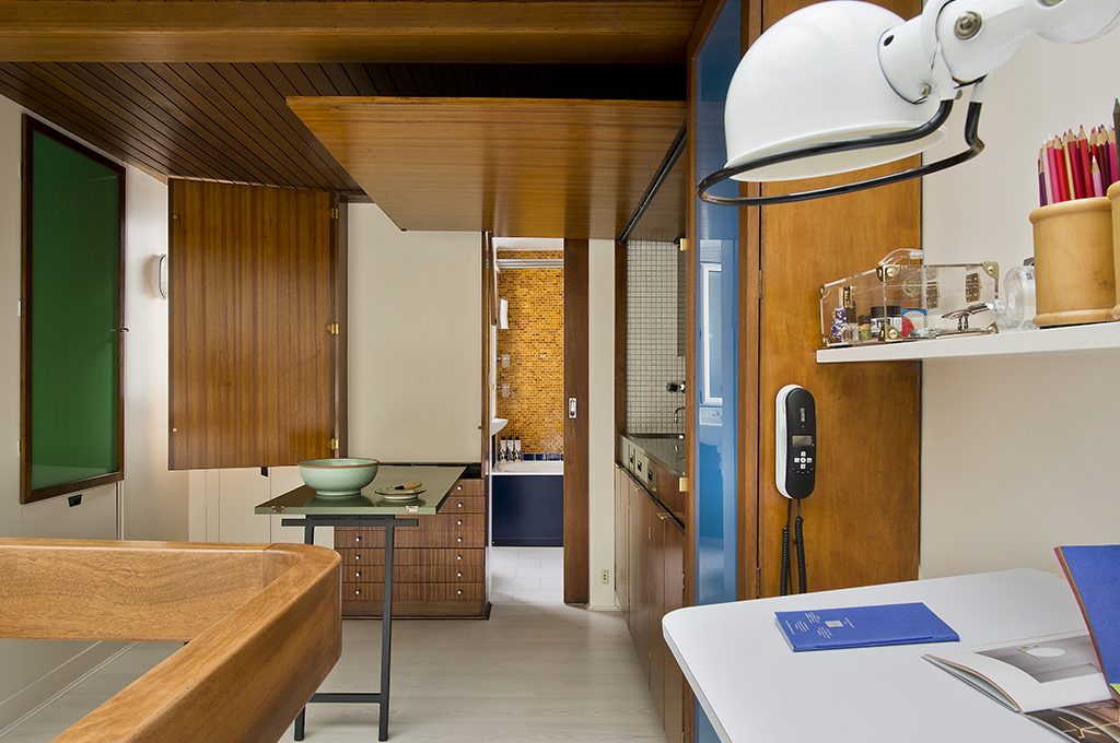 La casa è un gioiello di funzionalità e stile, un campionario di soluzioni intelligenti e salvaspazio realizzate con i materiali degli Anni ’60: mogano, formica, acciaio, ferro battuto, peltro e compensato.