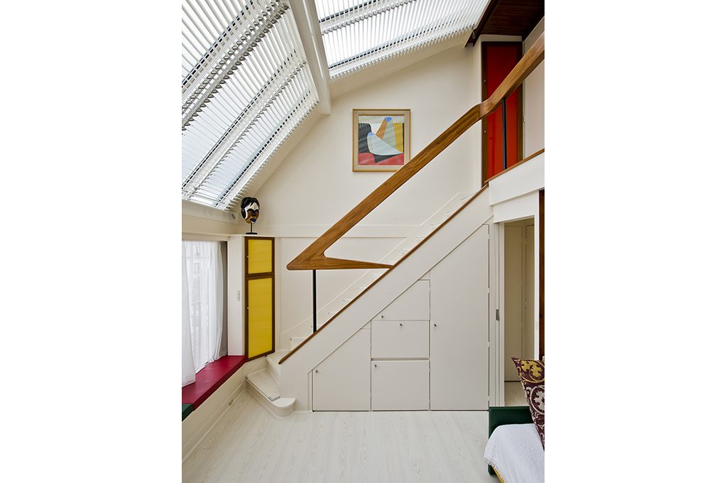 L’appartamento è un duplex, cioè una casa su due piani. La scala, il cui corrimano crea un ‘festone’ decorativo, è così ampia da fare del secondo livello un soppalco. Particolare la vetrata che si piega seguendo la falda del tetto e illumina tutta la casa.