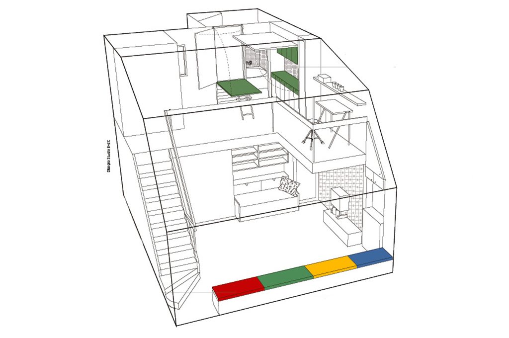Il soggiorno, sistemato al livello inferiore, è incorniciato dal caminetto da un lato e dalla scala dall’altro. Il divano letto è incastonato in una nicchia insieme alla libreria. I vani-contenitore sono sempre integrati nell’architettura. Sopra al soppalco, la cucina a scomparsa con il tavolo che si alza e si abbassa, e un piccolo studio.
