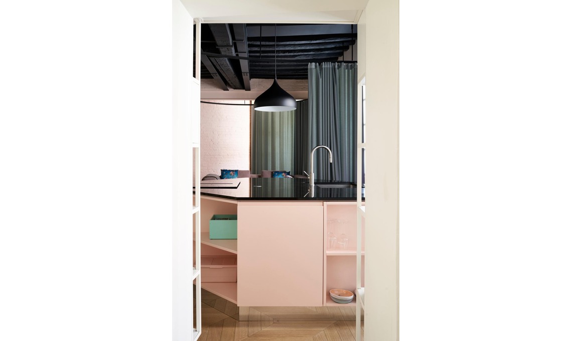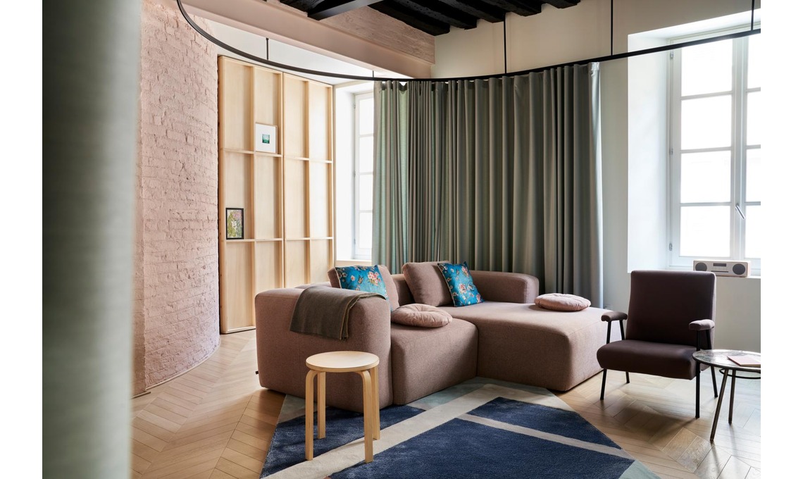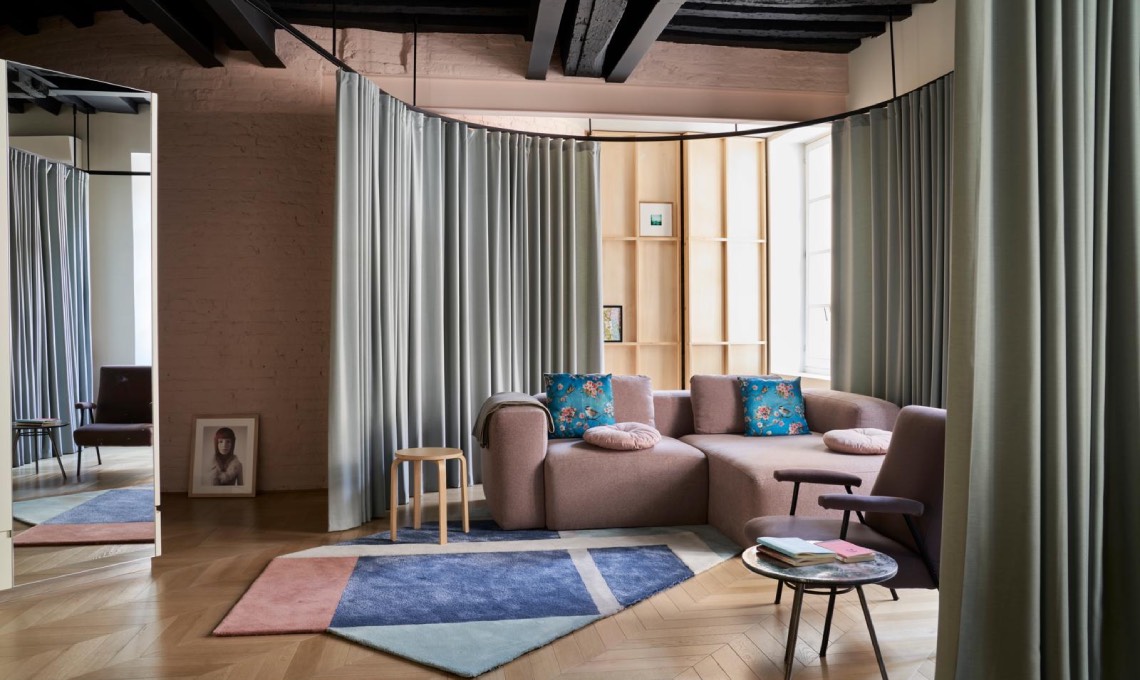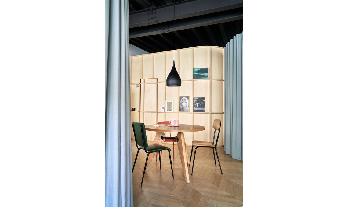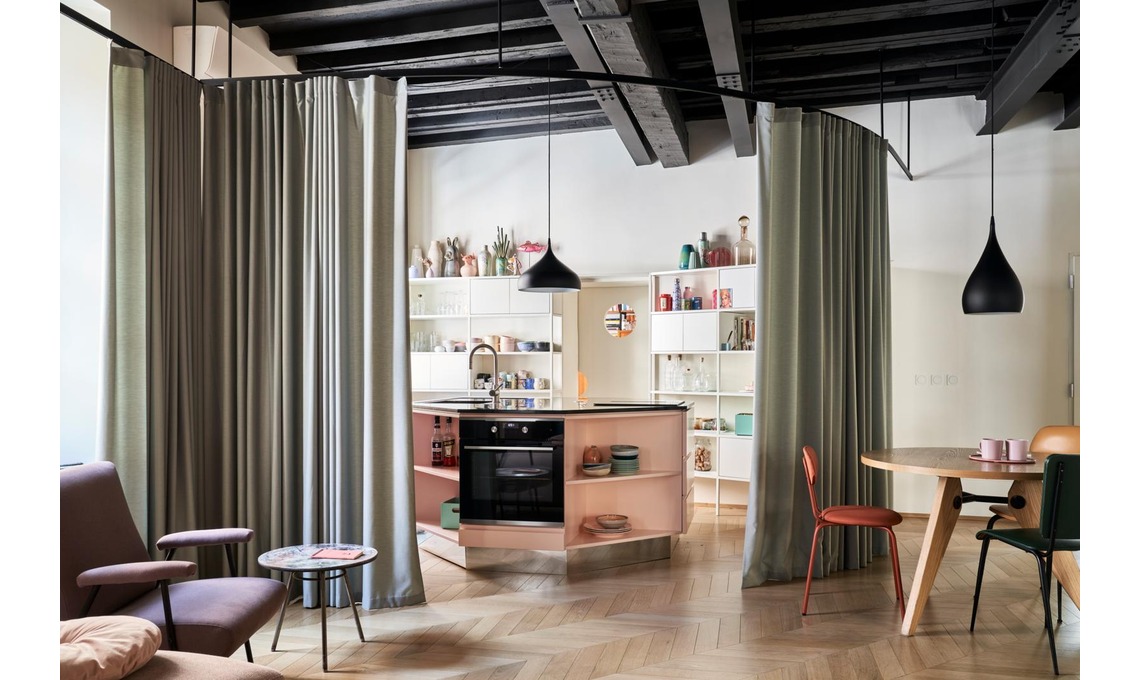 Un open space eclettico con una parete curva e tende al posto dei muri