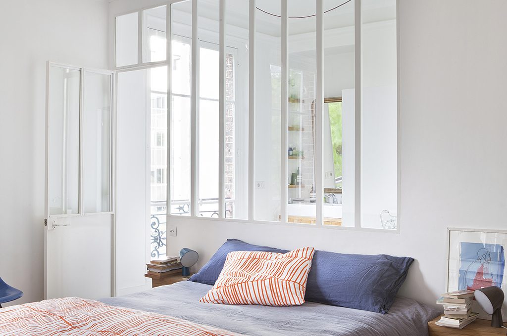 Per la camera da letto è stata pensata una parete vetrata con una divisione verticale che ricorda le serre da giardino di fine '800! Un'idea non impossibile da copiare! La vetrata divide la camera dal bagno, è il parquet a uniformare e unire i due ambienti