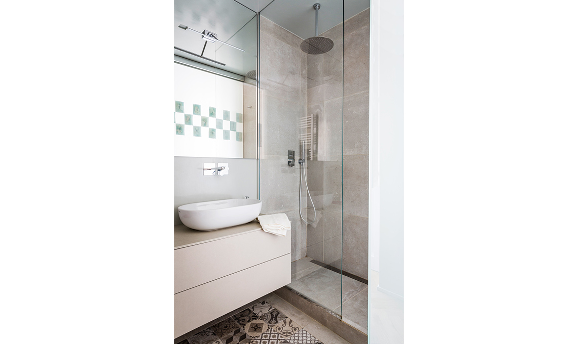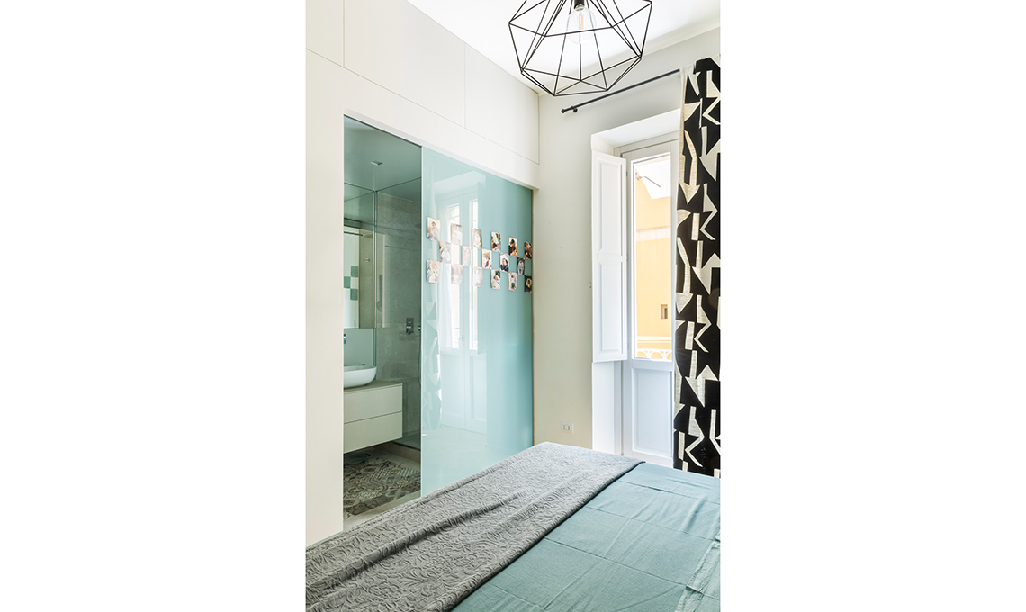 La porta in vetro temperato satinato che divide il bagno dalla camera da letto ha la particolarità di avere una parte fissa che delimita la doccia e una scorrevole che si apre in corrispondenza della zona lavabo. Il bagno, anche se cieco, così ha un’illuminazione indiretta!