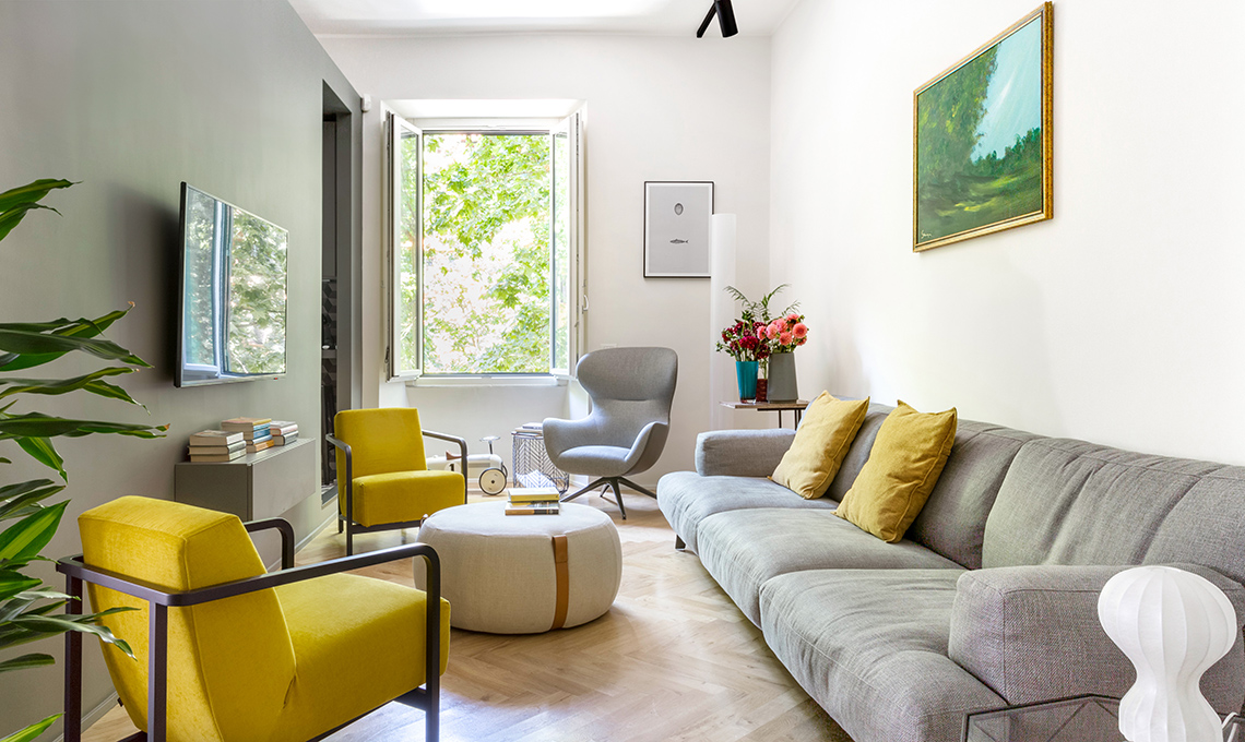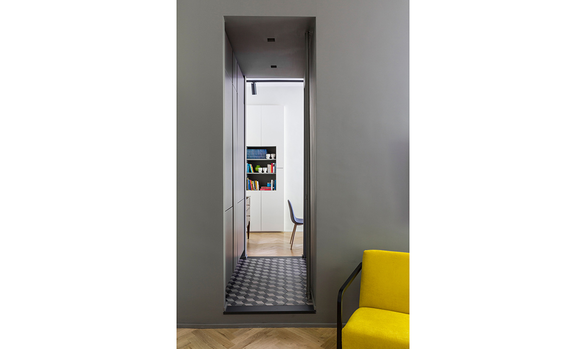 Il vano di 160 cm ha permesso di installare una porta scorrevole di dimensioni perfette. Poltroncine gialle Gilda [Porada da € 2108,57], pouf Notch [Lema, ø cm 85x40h da € 1.512], poltrona Mad Joker [Poliform, prezzo su richiesta].