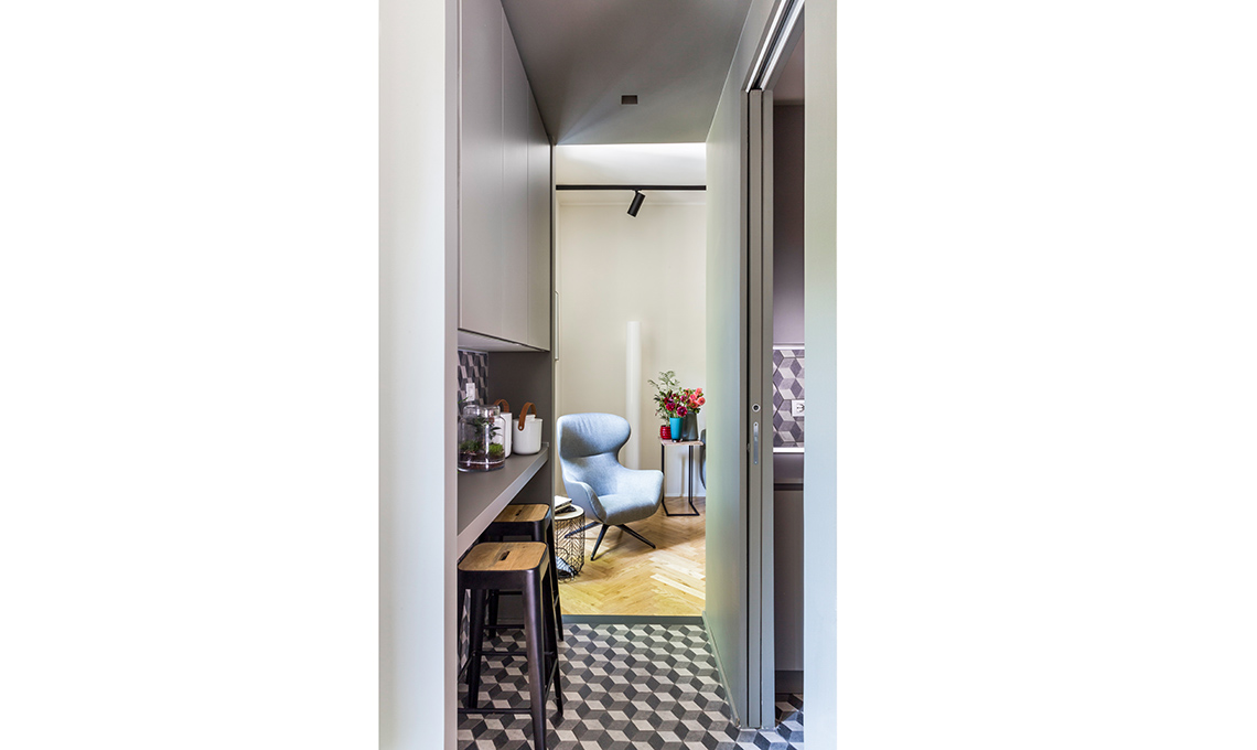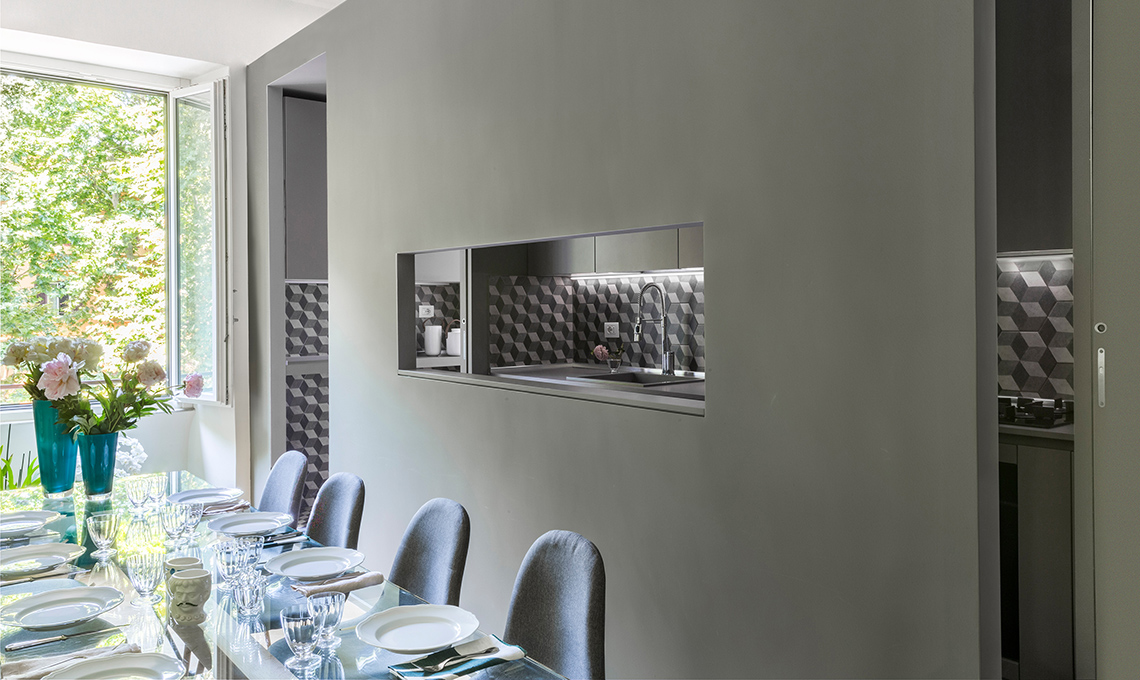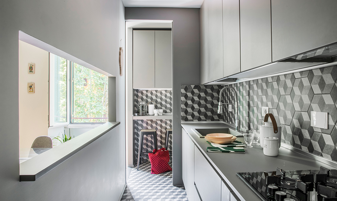 Come far stare salotto, pranzo e cottura in una zona giorno di 40 mq? La soluzione è la cucina passante che permette, anche in spazi minimi, di dare ai fornelli una stanza a sé.