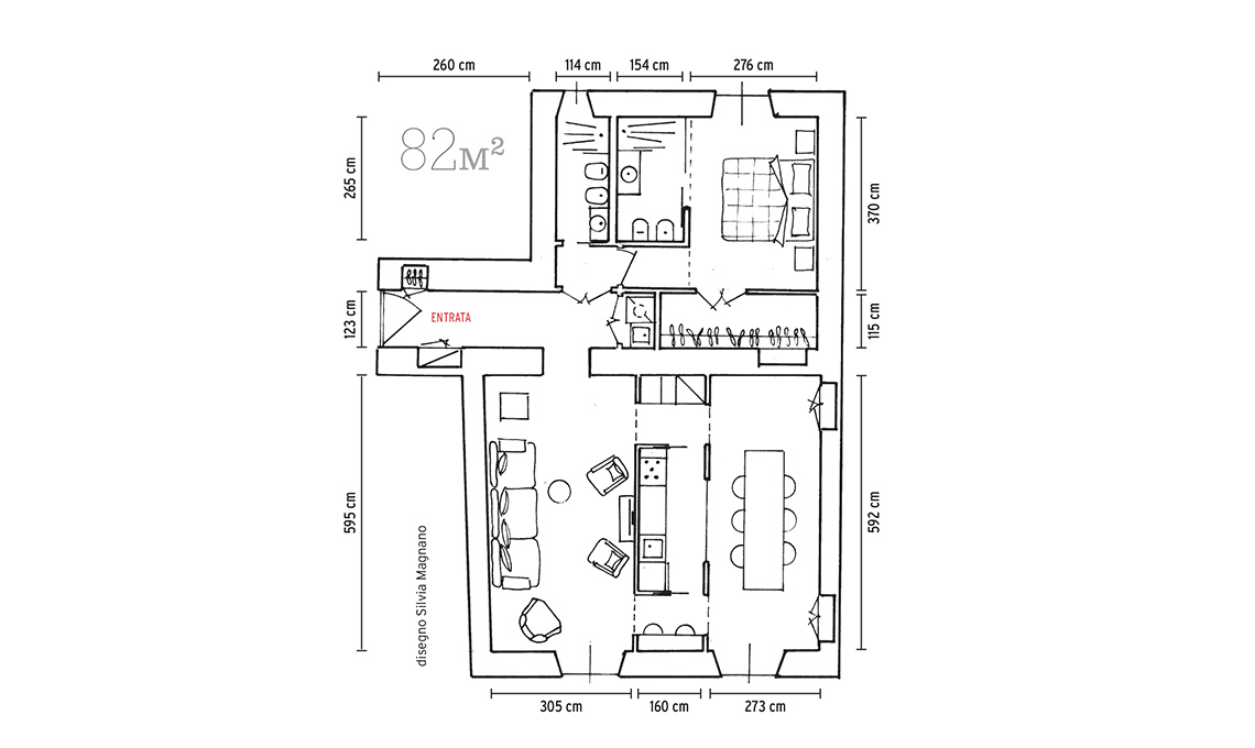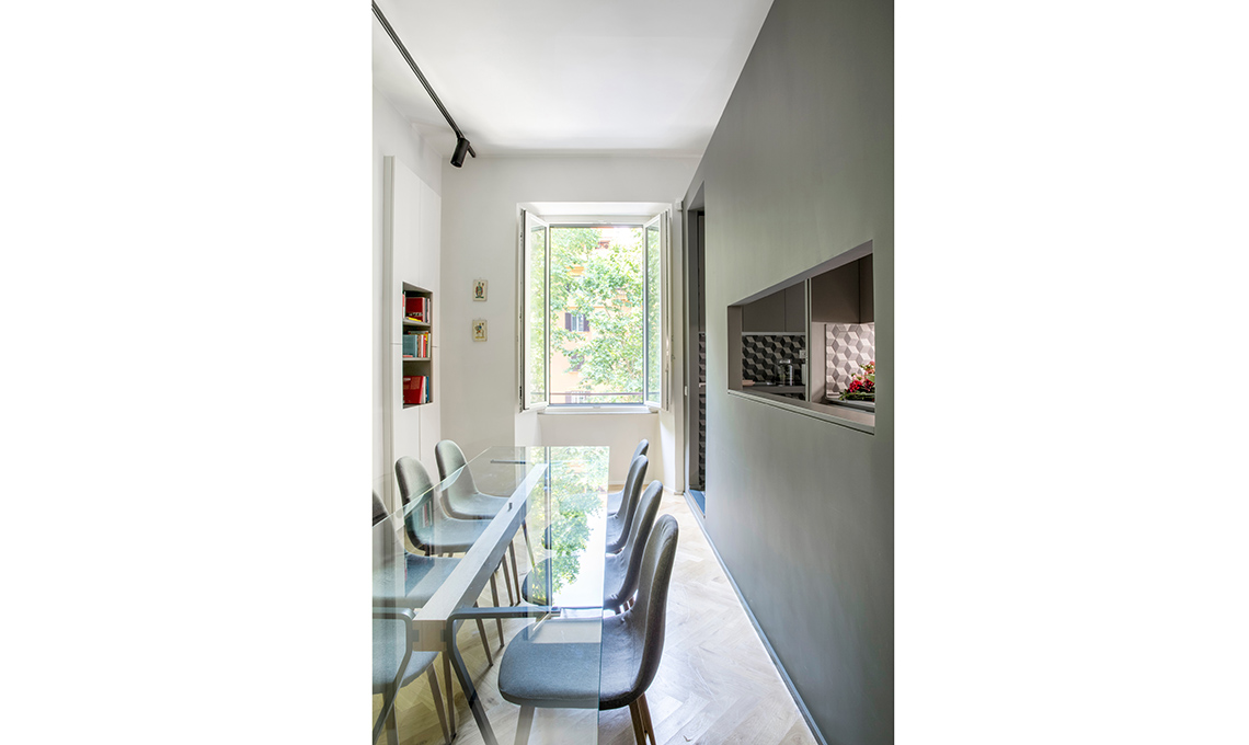 I proprietari avevano un’idea chiara: «Non volevamo una cucina a vista perché ci sembrava qualcosa di ‘sgarbato’ per l’occhio. Adoriamo gli impianti di vecchio stampo, il salotto indipendente dalla sala da pranzo e la cucina ulteriormente separata da questa» sottolinea Stefano. Gli architetti hanno quindi creato un volume-cucina come filtro tra il living e la zona pranzo: uno spazio ‘bucato’, passante, in cui entrare, affacciarsi, o da attraversare. Tanto il soggiorno quanto la sala da pranzo sono concepiti come ‘cannocchiali’ stretti sul focus delle finestre: una scelta resa netta e piacevole da divano e tavolo molto lunghi, che lasciano la luce libera di fluire da un lato all’altro della stanza.