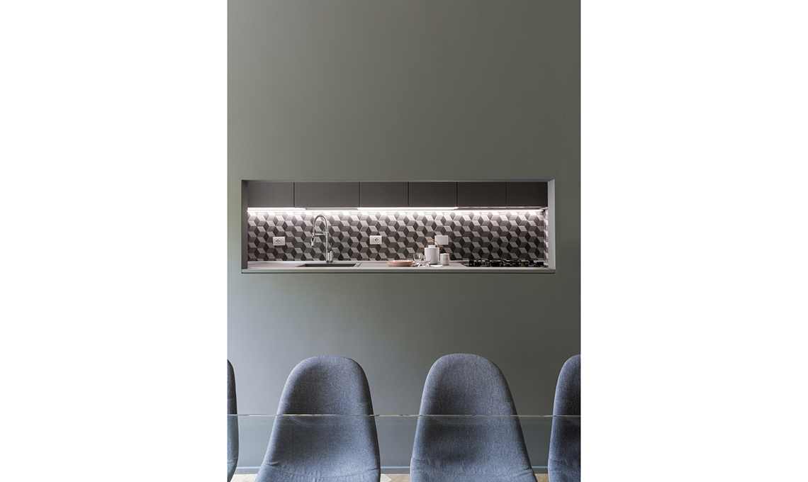 Cucina [Lube] rifinita con piano in FenixTM e piastrelle in grès porcellanato Firenze Decor Grey [FAP Ceramiche]. Testa caltagirone Malandrina e vaso in ceramica decorato a mano Malandrina con diadema [€ 53], entrambi di [WFTB].