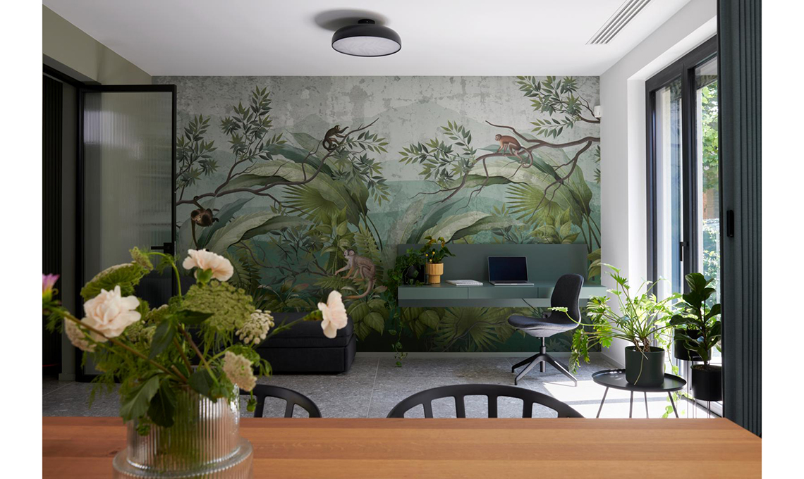 Carta da parati Inside the Jungle [Now Edizioni], lampada a soffitto Budino [Vesoi], lampada da terra Luminator Blue [Flos], porta in alluminio e vetro cannettato [Doal], serramenti in alluminio Iron Line finitura Panther 11 Antracite scuro Soft Touch [Ponzio]. sedie Venice Mat nere [Kartell], scrittoio Onice Ala [Pianca] con sedia ufficio Langfjall [Ikea], tavolino in metallo nero [H&M Home], tenda tessile [Dooor].