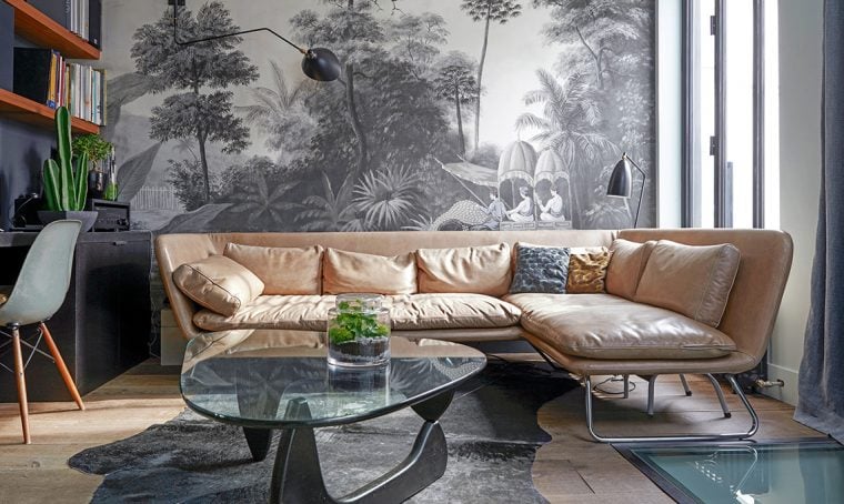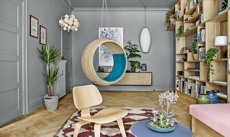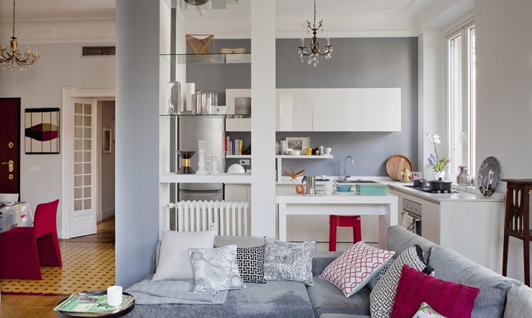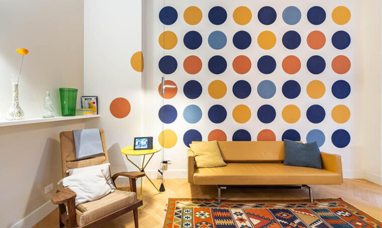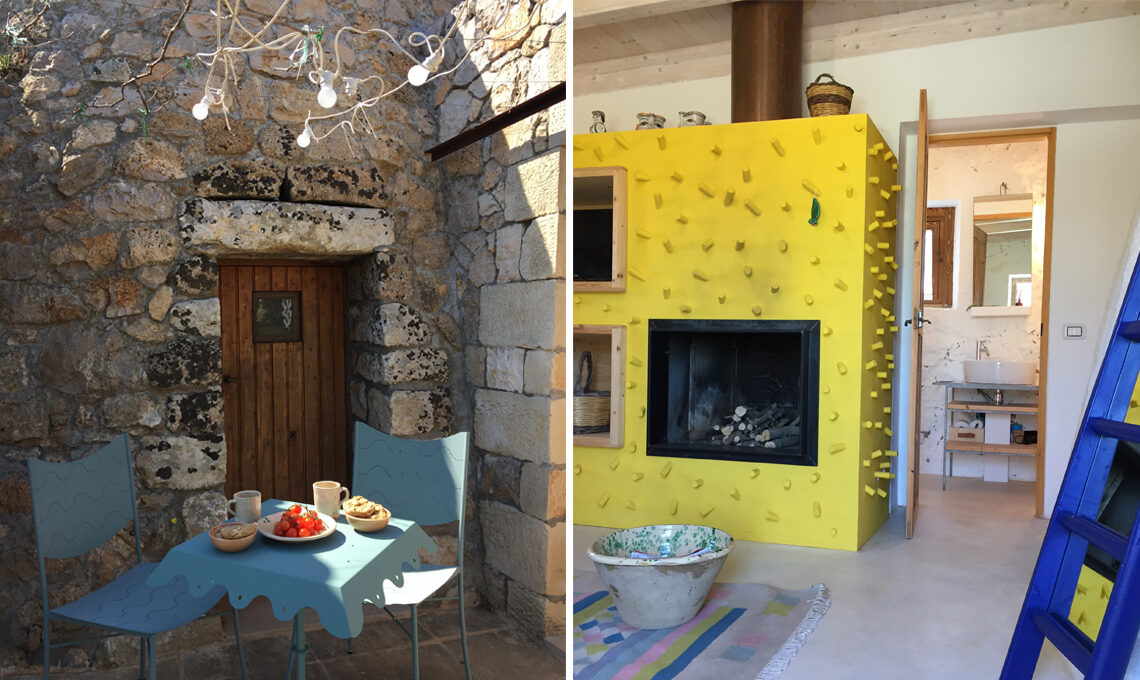 Al suo interno il pavimento è stato realizzato in cemento e le pareti in pietra viva sono state dipinte di bianco calce, per aiutare la diffusione della luce. Tra gli arredi spicca un'armadiatura in legno, realizzata su disegno, che contiene un camino, una libreria e una piccola dispensa. Il colore saturo e solare la rende protagonista dell’ambiente. Il suo decoro tridimensionale è una trovata funzionale: i pioli possono infatti essere utilizzati come appendiabiti.