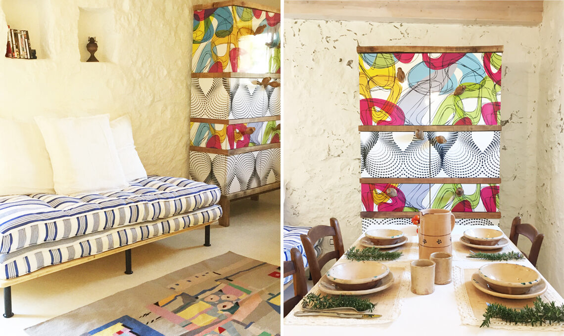 La tradizionale credenza ha una veste più contemporanea grazie all'uso di grafismi e colori che ne decorano le ante in laminato di recupero, proveniente cioè dallo sfrido di diversi tipi di laminato. Interessante il contrasto tra questo materiale sintetico e la pietra imbiancata delle pareti.