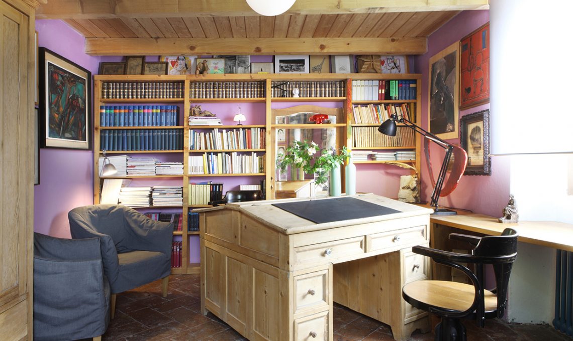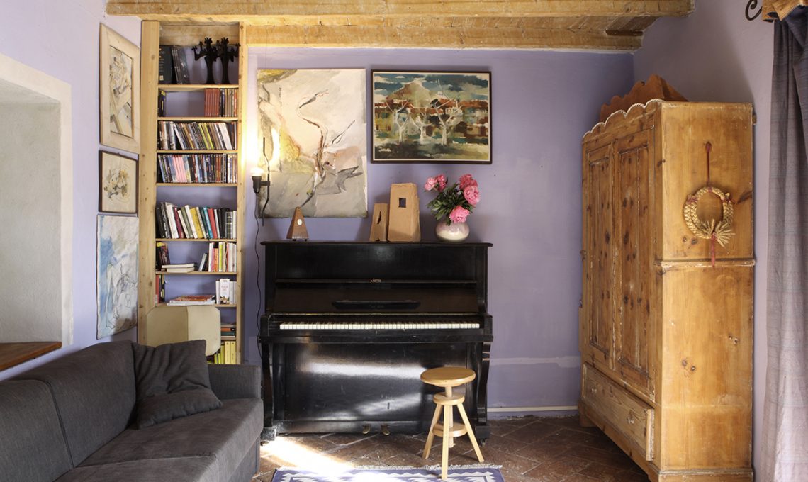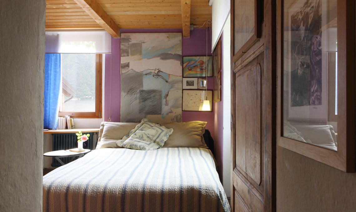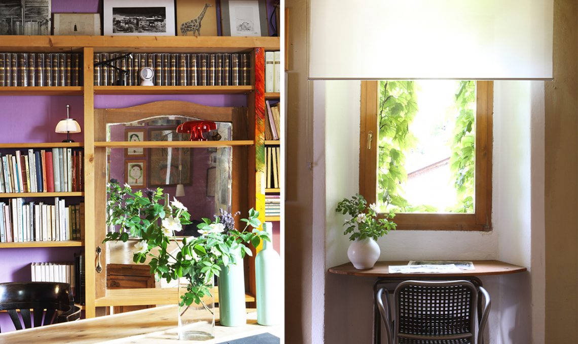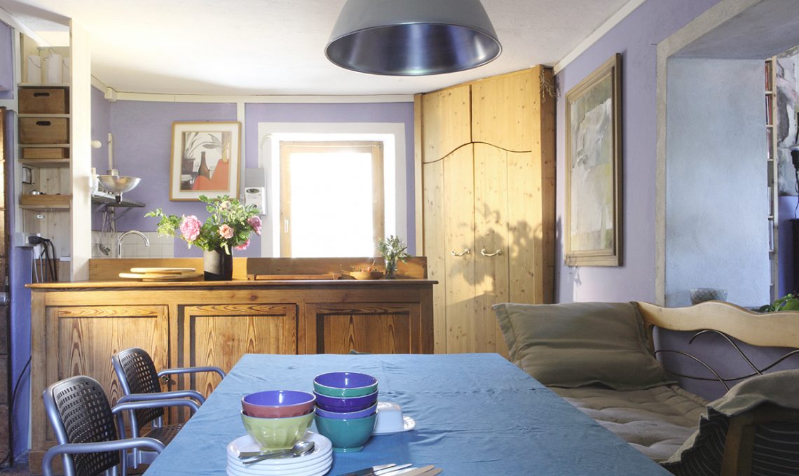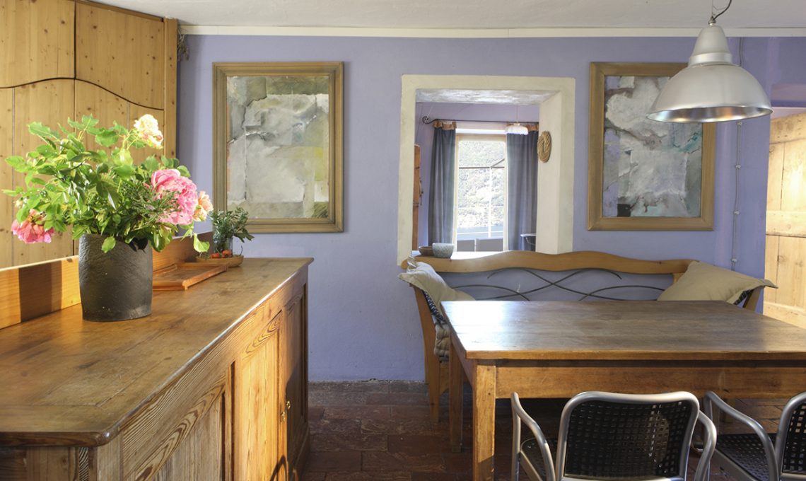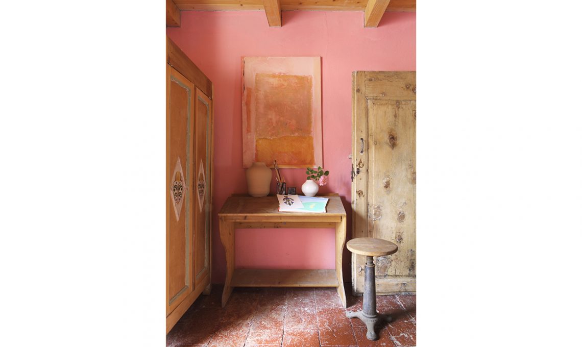 Per dare contrasto al legno naturale e al cotto recuperati, le pareti sono state dipinte con colori accesi, scelti per sfumature affini: pervinca al piano terra e lilla e rosa antico per le camere, al piano superiore. Nella grande stanza da letto una zona studio è allestita con una curiosa scrivania bifacciale con piani inclinati a ribalta, recuperata da un vecchio ufficio postale tirolese.