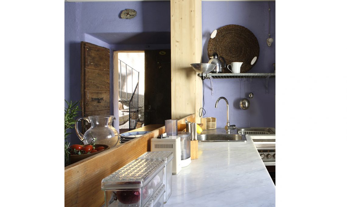 La cucina ha accesso diretto dal mezzanino d’ingresso, che anticamente era all’aperto. Anche qui, come nelle altre parti della casa, la scelta è stata di conservare gli elementi esistenti e di recuperare tutto il possibile. Per dare unità ai moduli della cucina, quelli contenitori e quelli per gli elettrodomestici, si è scelto un top su misura in marmo bianco, che ha il pregio di dare luce all’ambiente. L’impianto elettrico, rifatto a norma, è stato lasciato per scelta esterno muro, come una volta, e usa la ‘treccia’ di fili rivestita di cotone tipica di inizio secolo.
