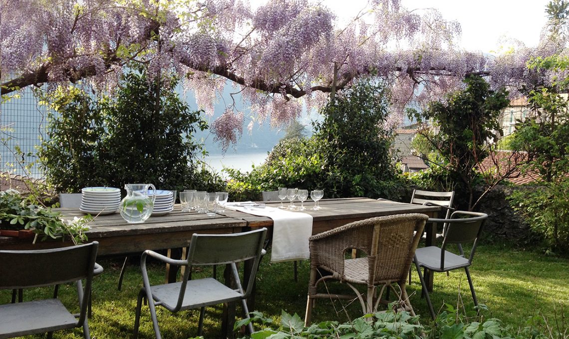 Nel giardino vista lago due tavoli gemelli 90x180cm possono comporre un’unica lunga tavolata o un ampio desco quadrato. Le sedie di recupero sono trattate con Ferox antiruggine e uno smalto micaceo.