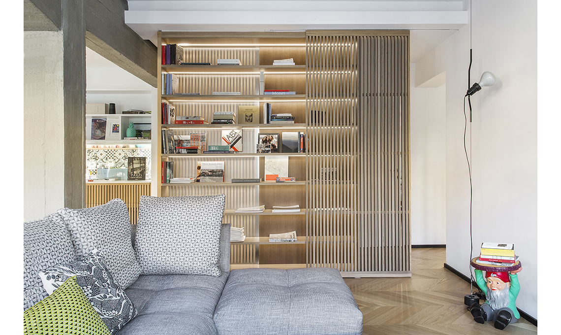 La libreria in listellare di Rovere è un diaframma che irraggia la luce e disimpegna la zona giorno da quella notte e i servizi, grazie a due porte che chiudono o aprono il sistema a seconda delle esigenze.
