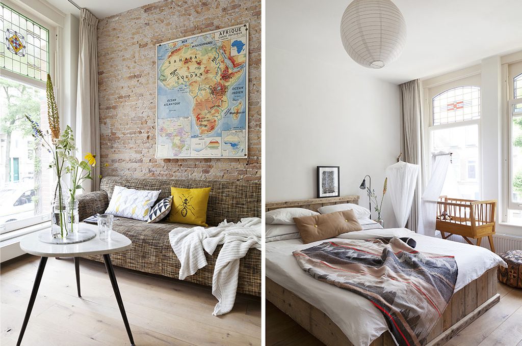 Questa atmosfera vintage rende accogliente l'involucro 'industrial' della casa. Lo stile cromatico aggiunge la nota di calore. Nuances dei marroni e gialli evocano i colori della terra e sono dappertutto: dai decori della finestra, ai tessiili, dalla parete in mattoni alle stampe.