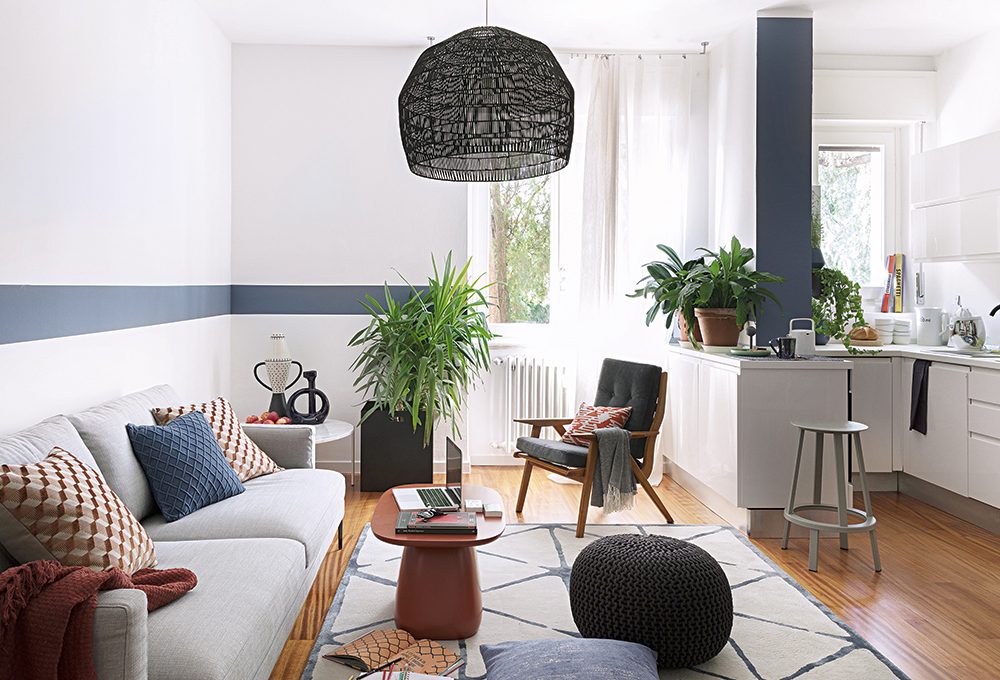 La casa gioca con colori soft e lascia protagonisti i materiali (il pavimento effetto pietra della zona giorno e un parquet caldo nelle camere), ma rompe lo schema con un blu vibrante, omaggio agli Anni ’80, che crea un effetto-scatola nel disimpegno e torna sul divano e sui cuscini in camera, con un effetto dirompente!