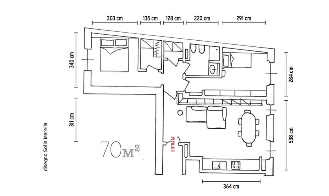 √ Per ampliare il soggiorno, il vecchio bagno lungo e stretto fra questo e la camera adiacente si sposta accanto al disimpegno: il living ne acquista la finestra. √ La cucina si inserisce nella nicchia a destra dell’ingresso ed è celata da una porta a soffietto.