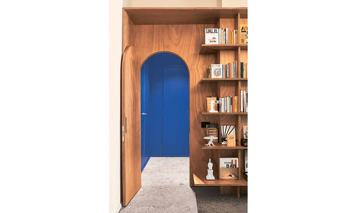 La porta che dà nella zona notte è ’intagliata’ nella boiserie che fa da fondo alla libreria a tutta parete del living. Quando è chiusa, la maniglia light la rende