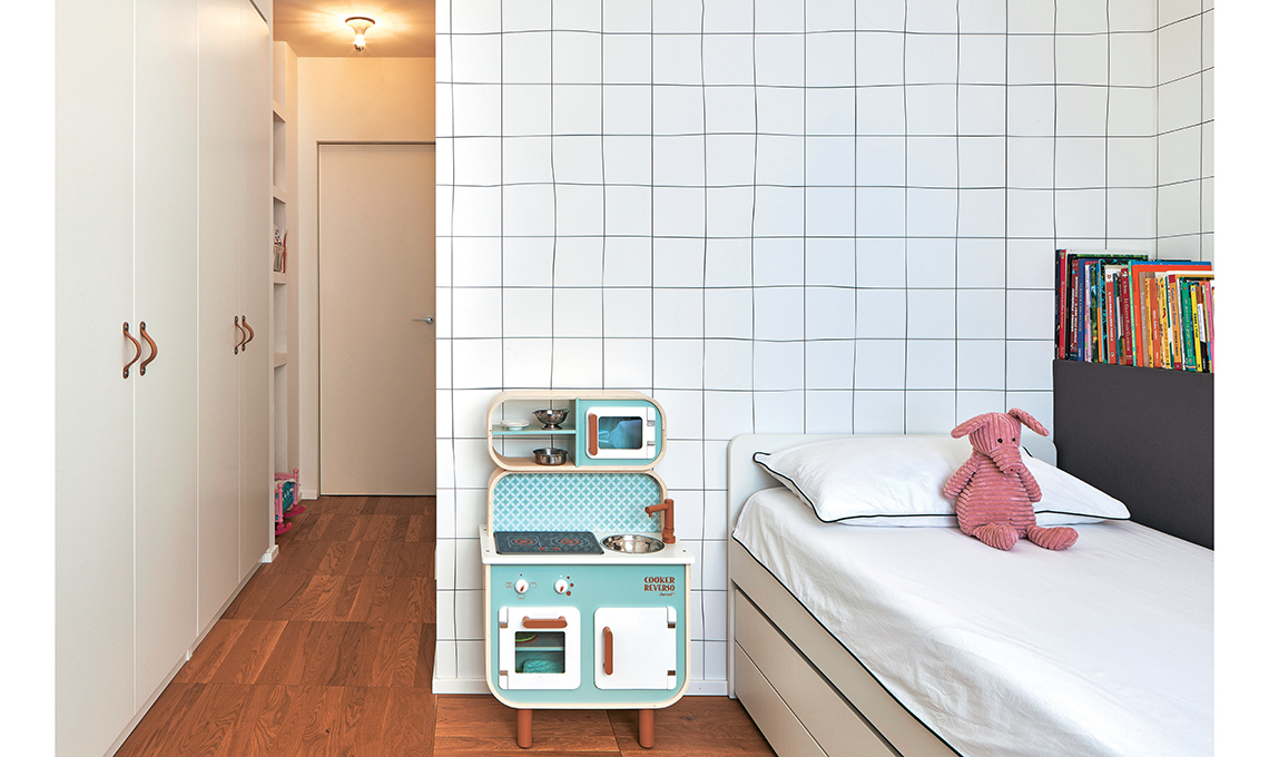 Questo tipico appartamento degli Anni ’60 è stato riprogettato dai proprietari architetti con soluzioni moderne che uniscono estetica e funzionalità. Luca si è occupato del layout, Silvia dell’interior. Gli ambienti sono stati ridimensionati in base alle esigenze della famiglia: il bagno ruba un po’ di spazio alla cameretta ma ne regala al living; la stanza padronale acquista la cabina armadio.