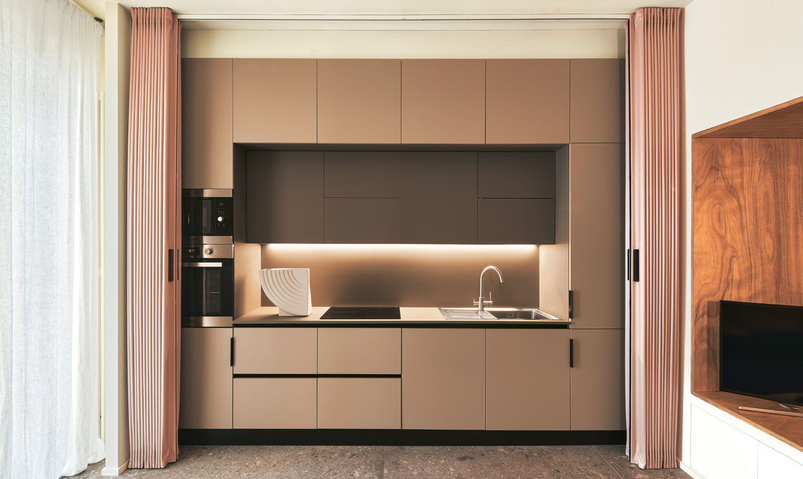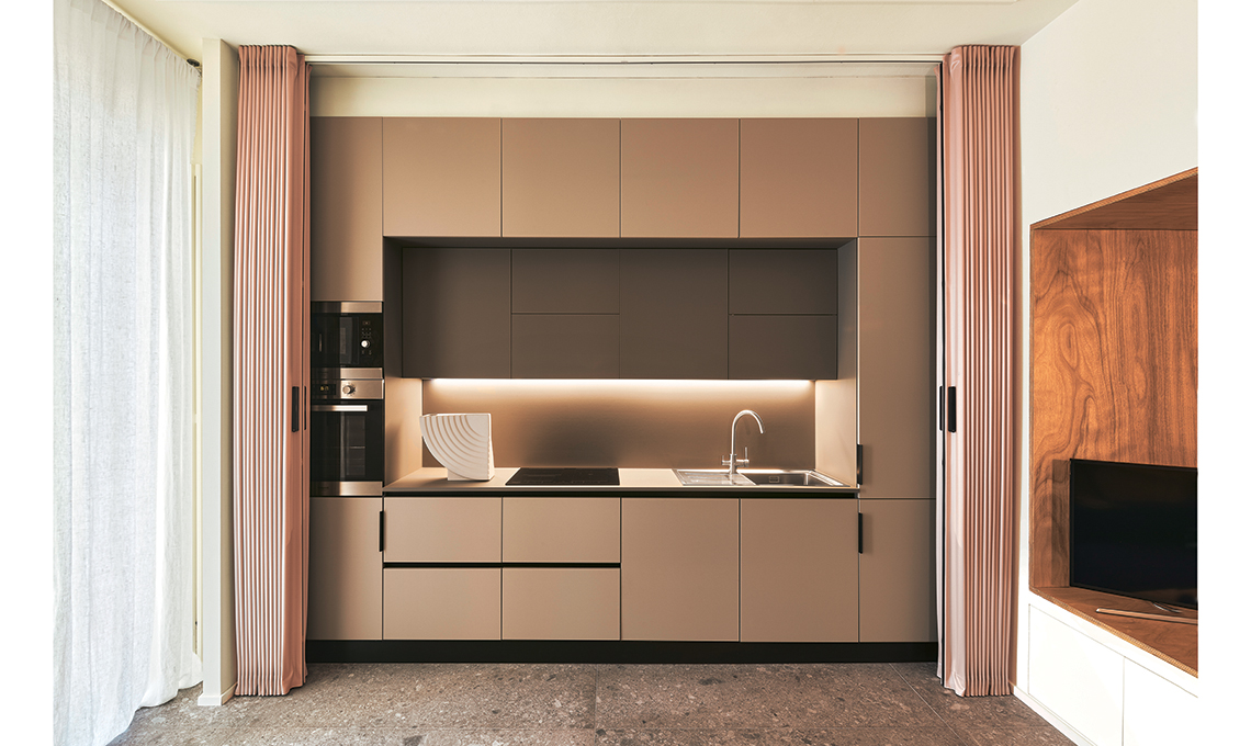 Nella grande nicchia esistente è stata inserita la cucina, dalla composizione ‘a portale’: due colonne laterali incorniciano la base operativa e culminano in una doppia fila di pensili di diversa profondità, distinti tra loro anche per il colore delle ante.