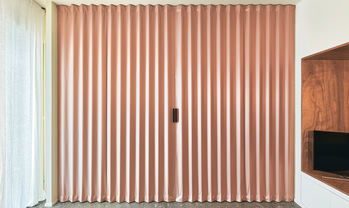 Non amando particolarmente la cucina a vista ma non potendone fare a meno in un living di queste dimensioni, Silvia e Luca hanno pensato di nasconderla dietro una porta tessile. Qui è formata da 2 pannelli (che coprono un vano da cm 364x300h) in ecopelle effetto seta rosa cipria con profilo a calamita, che scorrono sul binario a soffitto e si possono aprire sia al centro sia ai lati [Door].