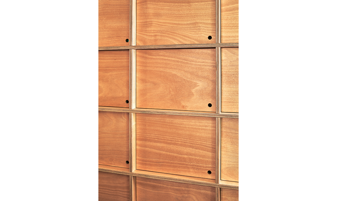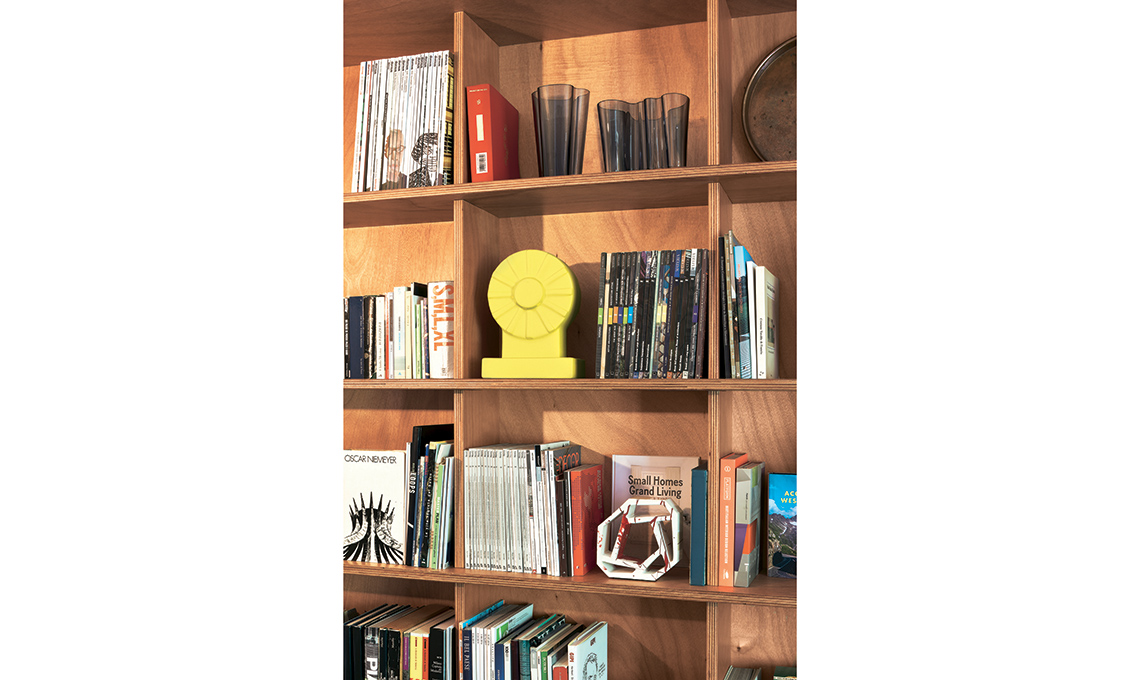 La libreria, realizzata su disegno di Silvia in multistrato marino di okumè, nella parte centrale ha i vani chiusi da ante a battente in cui riporre stoviglie e bicchieri.