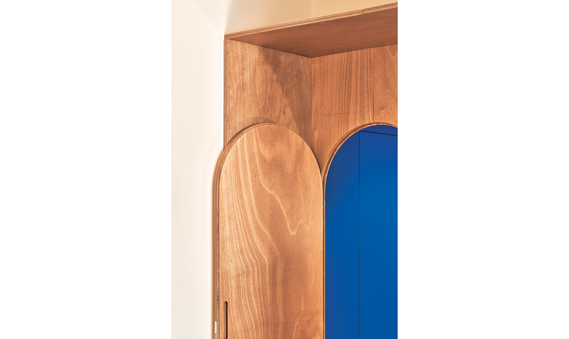 Quando è aperta, la porta lascia apparire il blu Klein (RAL 5002) scelto per creare un effetto scatola e dare carattere al disimpegno. Questa tonalità, che riveste pareti, soffitto e porte laccate, è talmente brillante da risultare calda!
