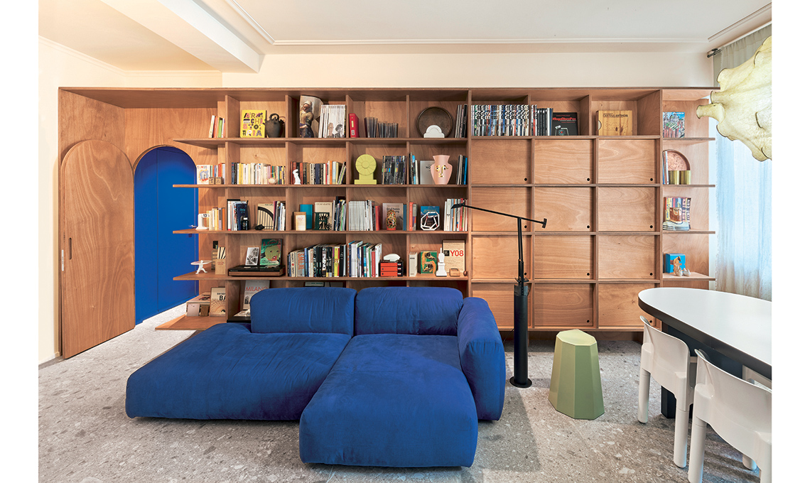 Definite le stanze, Silvia ha lavorato su mobili e porte, che voleva leggeri e funzionali ma anche d’impatto. È nata così la boiserie a tutta parete, attrezzata a libreria, che ingloba la porta del disimpegno della zona notte. Sul lato opposto c’è la cucina a vista, da celare dietro una porta a soffietto; al centro, solo un divano e il tavolo da pranzo.