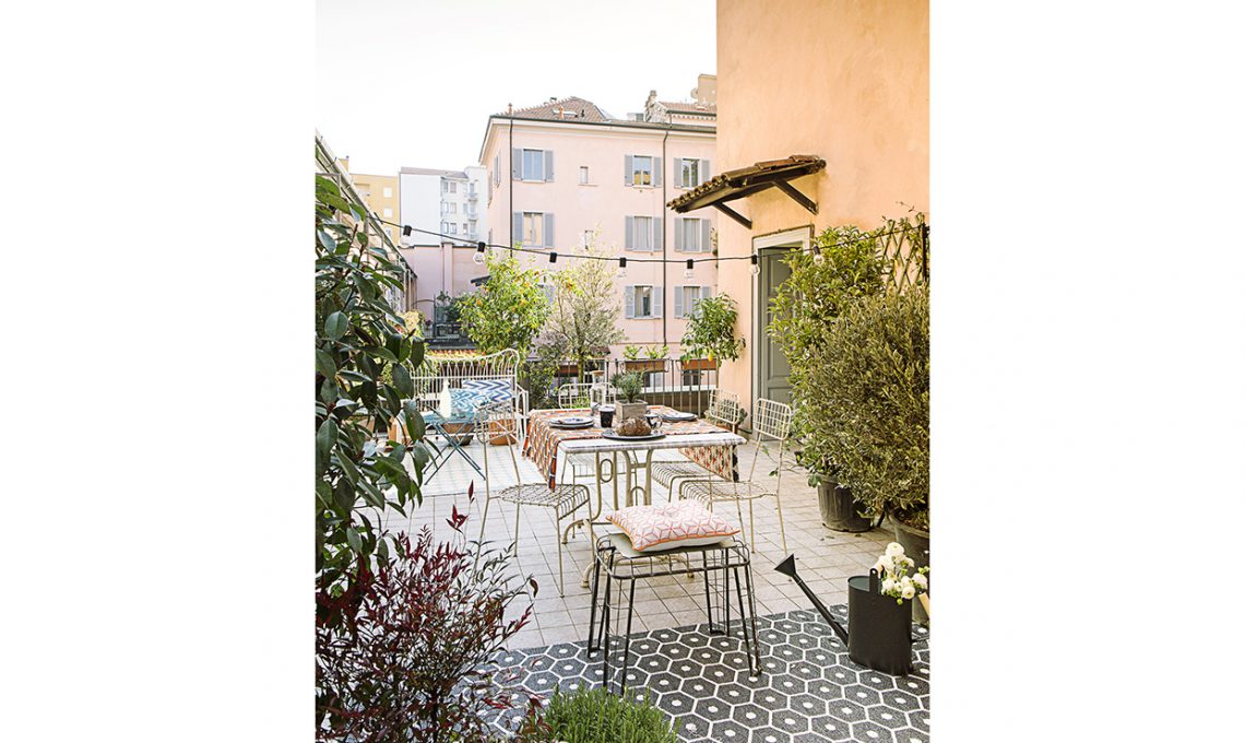 Nella bella stagione l’ampio ballatoio diventa spazio multifunzione: salottino, sala da pranzo e spazio working. Attorno al tavolo di famiglia con piano in marmo, sedie e sgabello in ferro [Novità Home €85,50 e €135], con cuscino [L’Opificio]. Tappeto [Pappelina €588].