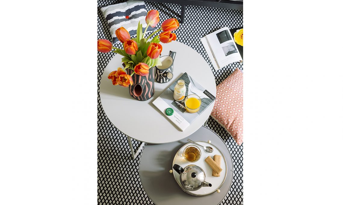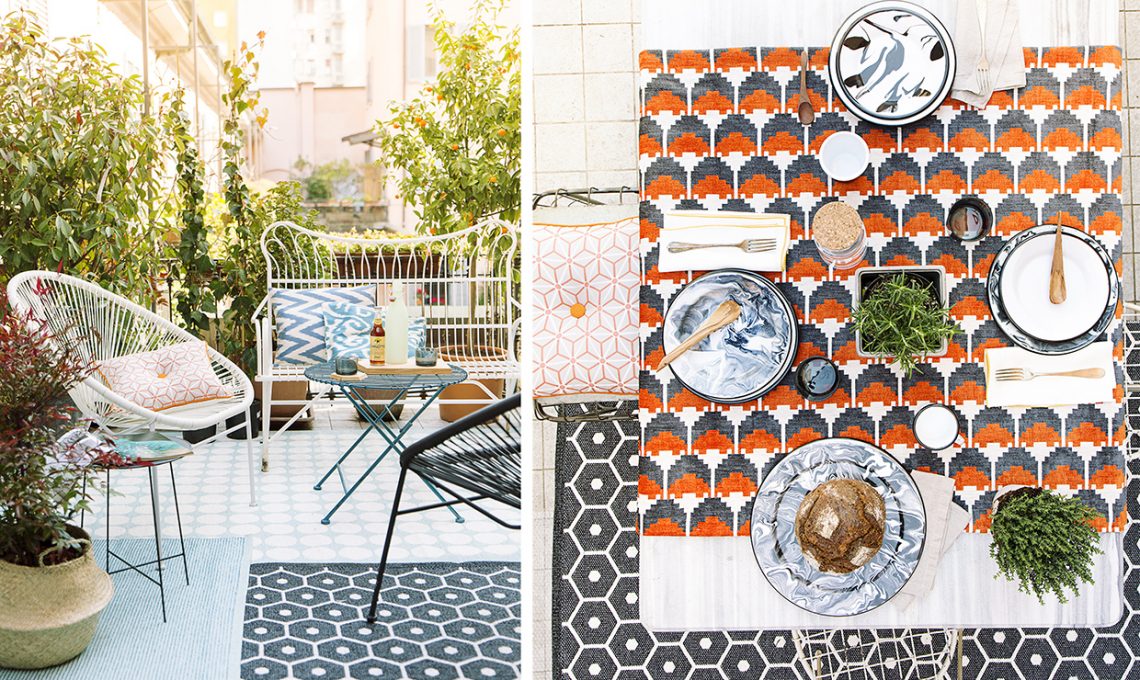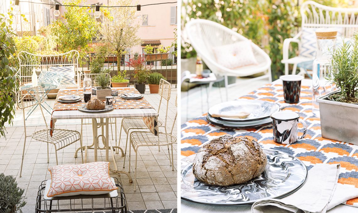 Divanetto in ferro e tavolino petrolio [Novità Home €379 e €96], poltroncine [Croff €48,99], tavolino basso nero [Diamantini&Domeniconi €198]. Tovaglia grafica [Kirkby Design], piatti in ferro smaltato marmorizzati [Les-Ottomans]. Tovaglioli di lino [MarinaC], bicchieri e caraffa [Bormioli Rocco], cachepot per le aromatiche [Puebco].