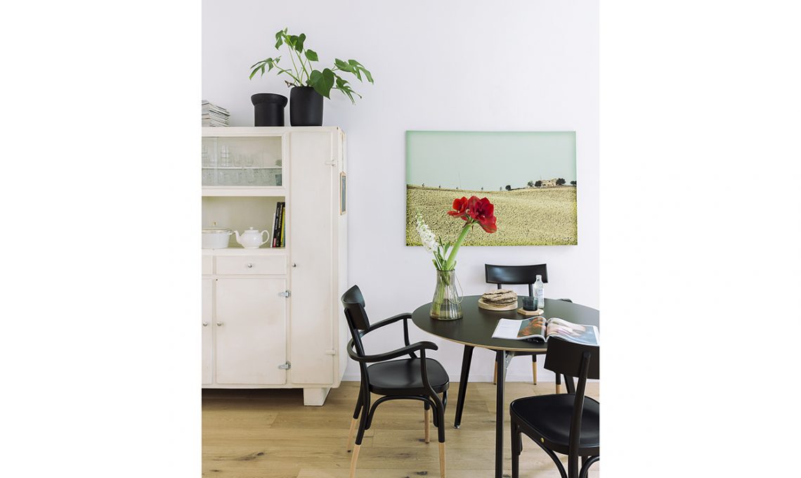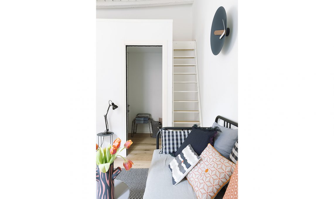 Si mimetizza con le pareti la scala in legno su misura, che sale sul soppalco. Qui si apre uno spazio di servizio che corre lungo tutto il muro, dove Giandomenico ripone l’attrezzatura da fotografia. Finalmente i cavalletti, gli stativi e i fondini non sono più a vista! Spezza il rigore del total white l’orologio grigio piombo Mozia [Diamantini&Domeniconi, ø cm 60 €271].