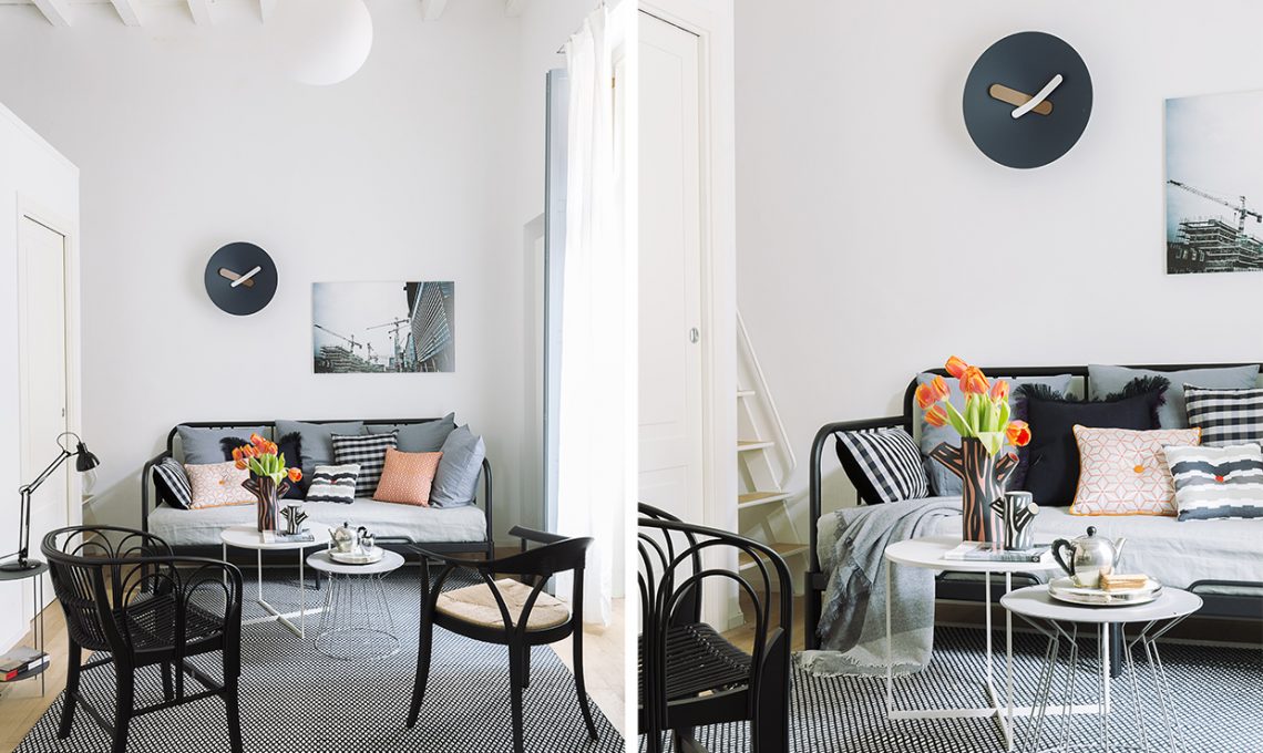 Bianco, nero e tocchi di colore per il monolocale-studio di 40mq dai mille usi