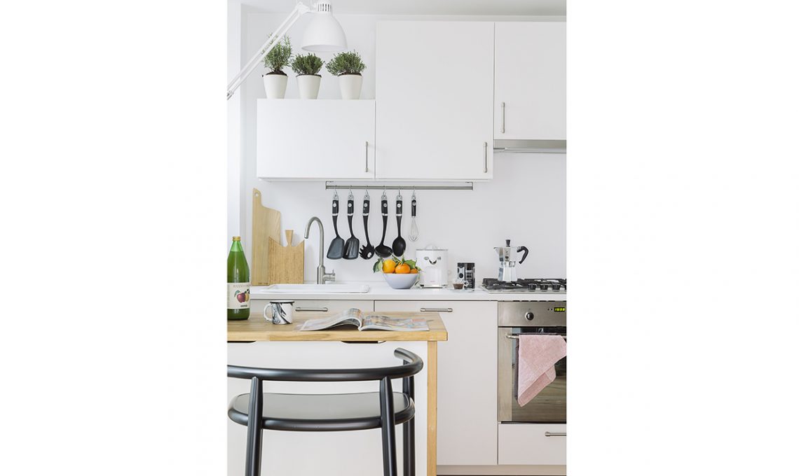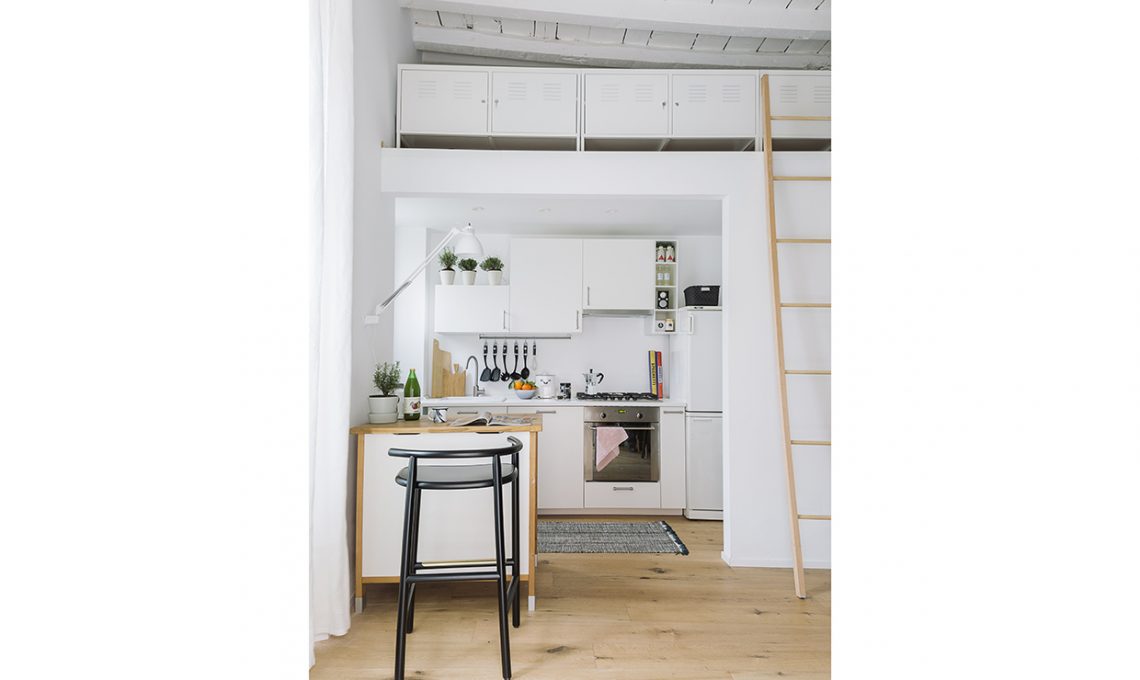 La nicchia sotto il soppalco è perfetta per la piccola ma attrezzatissima cucina [Metod di Ikea €800 la composizione] con isola snack illuminata dalla lampada a braccio JJ M New P-T [Leucos €209,84]. In nero lo sgabello-scultura disegnato da Nendo [Gebrüder Thonet Vienna €553,88]. Pentole [Tescoma], taglieri [Delamont], radio [Tivoli Audio], accessori [Bialetti e Fratelli Guzzini], tappeto [Fazzini].