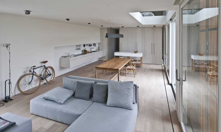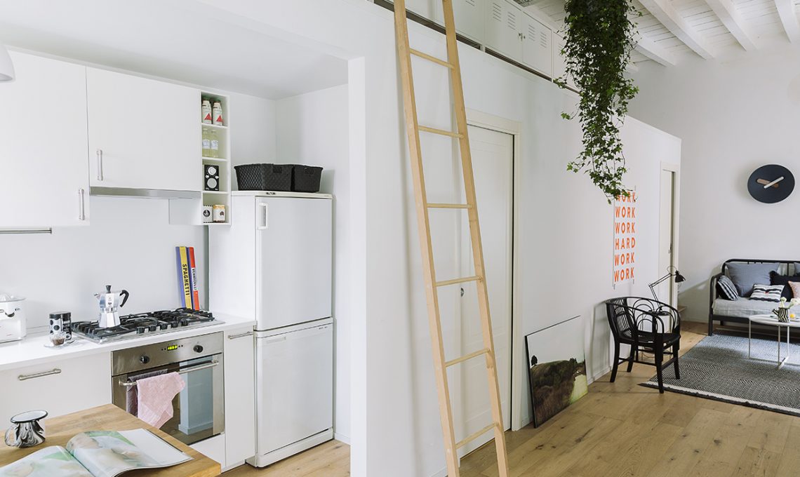 Uno studio-casa dallo spirito ‘nomade’, dove gli arredi possano essere spostati per trasformare lo spazio in set fotografico. Era questa l’esigenza di Giandomenico. La soluzione funzionale? Creare un soppalco ‘a scatola’ aperto sulla cucina con due nicchie a scomparsa per il bagno e la cabina armadio. Basta chiudere le porte scorrevoli, et voilà, ecco una parete bianca.