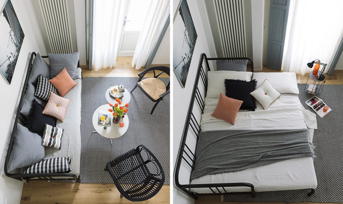 Dalle chiacchiere al sonno, basta un gesto. Divano letto Fyresdal [Ikea, cm 207x88x94h €269,88]. Tessile [MarinaC, La Perla Home Collection, L’Opificio, Design Republic]. Poltrone [De Padova].