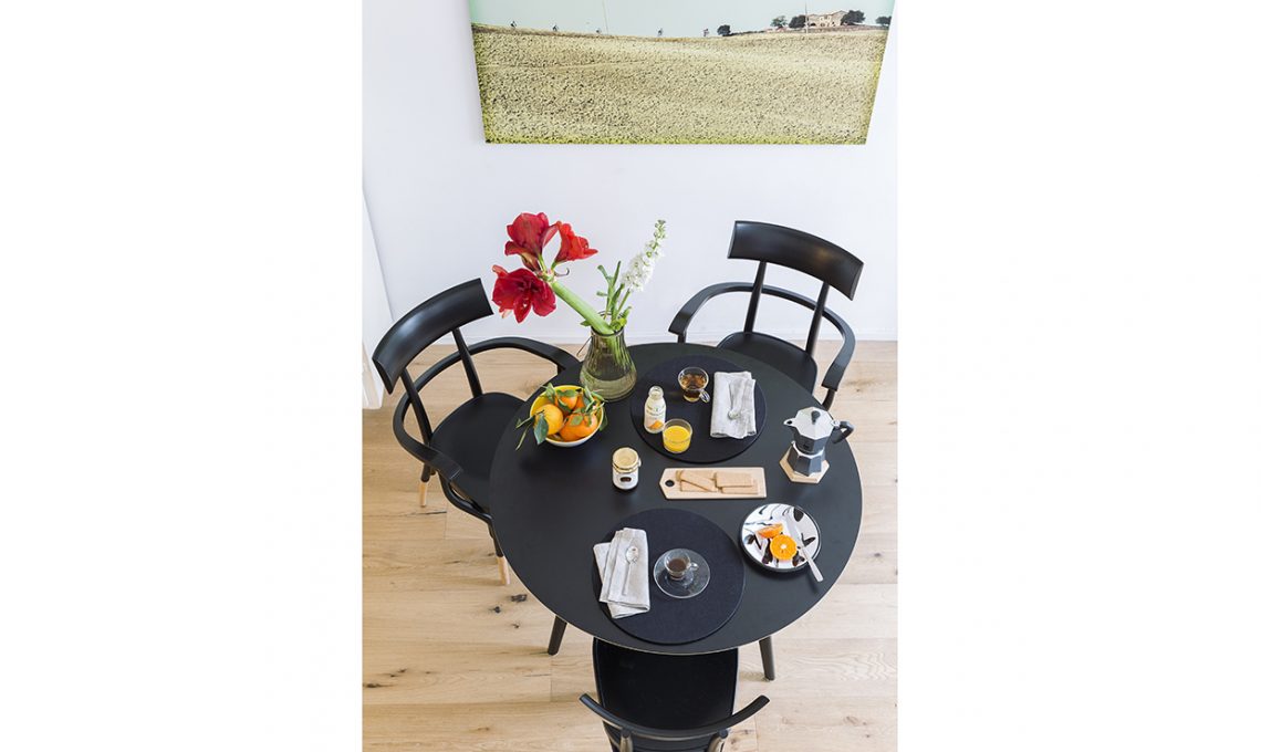 Separati, ma a vista. La zona pranzo dialoga con l’angolo sofà grazie agli arredi in black. Trait d’union la credenza Sixties. Tavolo Otis [De Padova €1.370], sedie Czech [Gebrüder Thonet Vienna da €441,64].