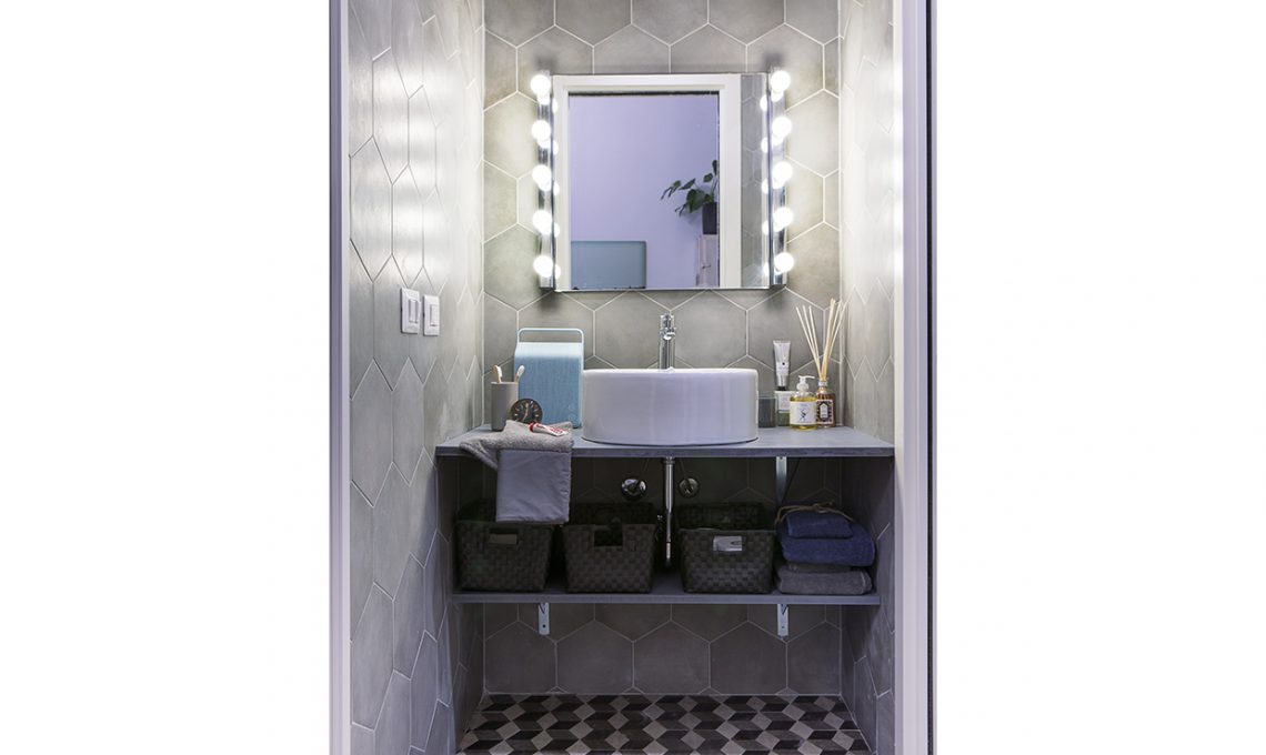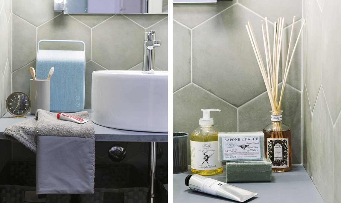 Rigore estetico e giochi di geometrie per il bagno ricavato nella seconda nicchia. Simil cementine le piastrelle esagonali in grès porcellanato. Decoro Seventies sul pavimento [collezione Firenze e Firenze Decò, Fap Ceramiche, cm 21,6x25 €71/mq e €83/mq]. Specchiera fatta da Giandomenico con due lampade a bulbi Ledsjö [Ikea €49,90 cad] ai lati dello specchio.