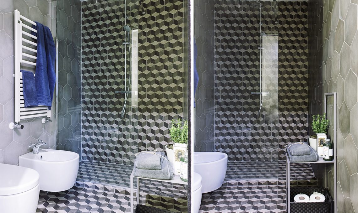 È schermato da un cristallo trasparente il box doccia con le cementine decorate che si srotolano come un nastro dalla parete al pavimento. Sanitari sospesi [Ceramica Stile, Gruppo Bea]. Tavolino [Arti&Mestieri], asciugamani [Fazzini].