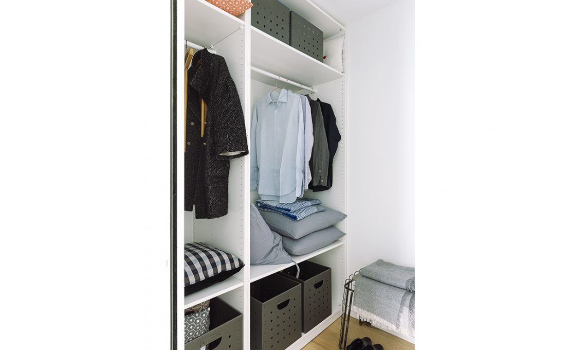 Lo spazio jolly è ricavato nella nicchia accanto al bagno. Un po’ cabina armadio, un po’ ripostiglio, Vanessa l’ha attrezzato con il guardaroba componibile a vista Pax [Ikea, cm 150x58x236h €144]. Per lo storage di ogni giorno, ma anche per l’archivio di Giandomenico, in tante comode scatole [Ikea €59 il set da 5 pezzi].