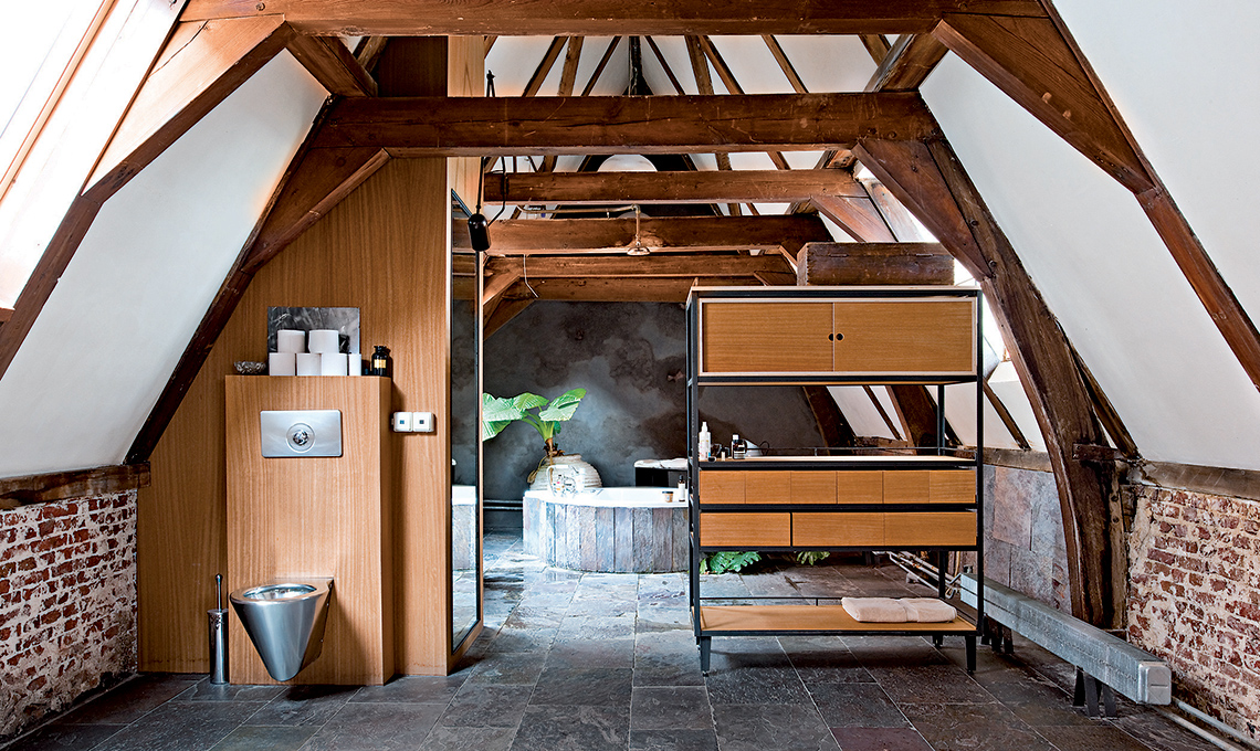 Un lungo corridoio e un nuovo spazio si aprono sotto le travi che imitano la magia di una cattedrale gotica. Questa volta, separata da un mobile contenitivo, ci sono una mini spa con vasca idromassaggio e una doccia in rame chiusa in una cabina di legno. I pavimenti in ardesia a spacco armonizzano le varie essenze e catturano la luce, avvolgendo la stanza in un’impalpabile atmosfera talcata.