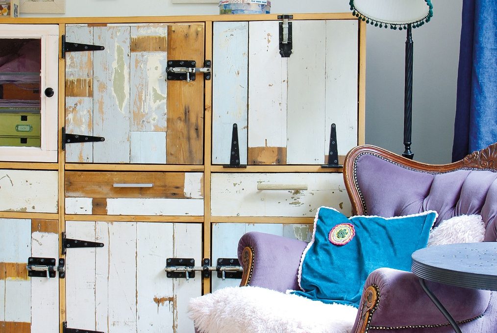 Per avere un angolino tutto suo, a Inge basta una poltrona in legno, pagata 1 euro al mercatino e rivestita con un tessuto viola. Il mobile, fatto da un falegname e formato da un patchwork di legno riciclato, è un perfetto esempio di stile “scrapwood”. Da Maisons du Monde trovi mobili simili (nella coll. Calanque) mentre JV Store propone la carta da parati con questo effetto, del designer olandese Piet Hein Eek (€199 il rollo da cm 48,7x9m).