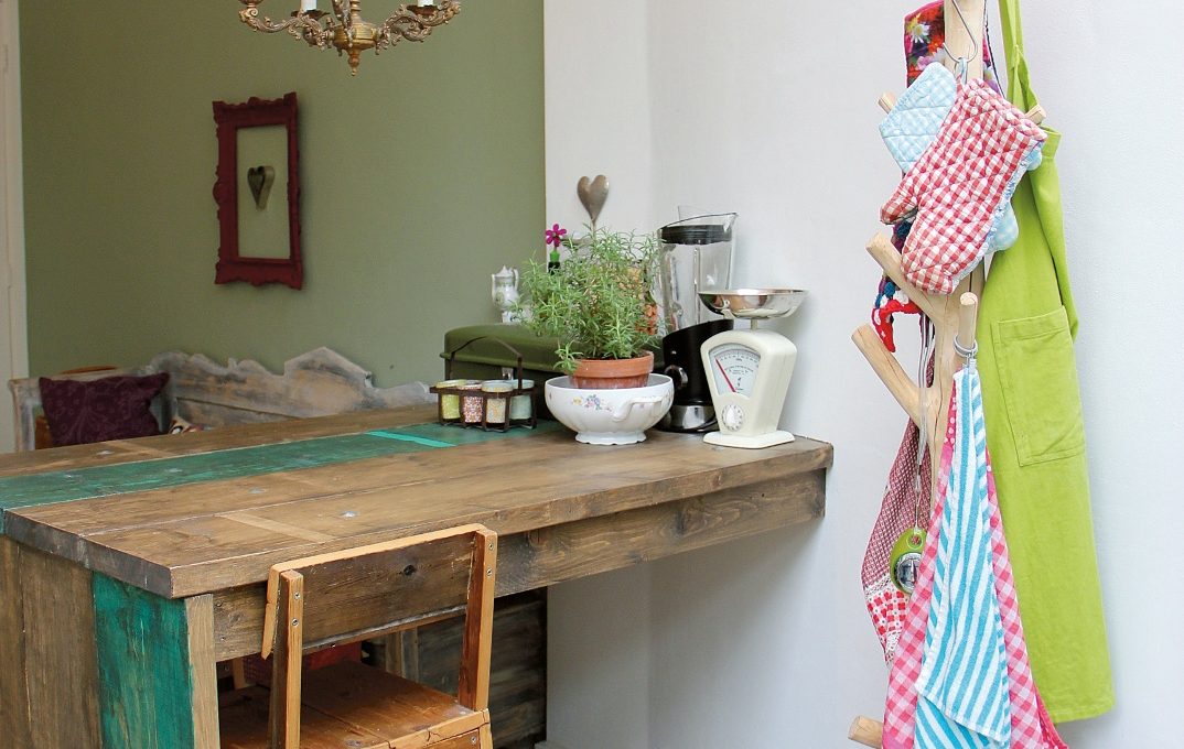 Il bancone in legno recuperato è il posto della colazione. Gli si affiancano due sgabelli alti, anch’essi realizzati artigianalmente, il cui look squadrato ricorda quello del modello SD-143 di Styledesign, in massello di faggio (cm 44x40x 102h €224) Il tocco ironico? Le candele fucsia sullo chandelier in stile, gli strofinacci colorati, l’albero con rami (è tutto vero!) cui sono appesi.