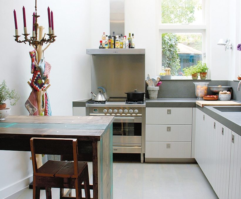 «Quando abbiamo messo mano alla casa, apportando notevoli modifiche per renderla vivibile al meglio per tutta la famiglia, abbiamo deciso di ingrandire la cucina, prolungandola verso il giardino». Per aumentare la luce nella zona operativa, Inge e Roel hanno fatto realizzare un lucernario in vetro satinato. «Questo è l’ambiente in cui le varie anime della casa -industriale, scrapwood e tradizionale- convivono al meglio».