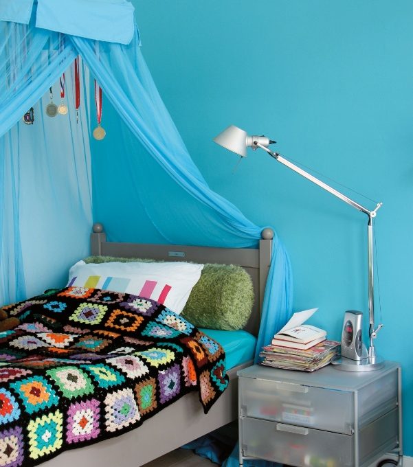 Per la parete della testiera del letto -e per la zanzariera!- Skip, appassionato di aerei, ha voluto il colore della compagnia aerea di bandiera olandese KLM. Il letto, acquistato in un mercatino, è stato ridipinto di un grigio simile a quello del comodino su rotelle e degli armadietti. La coperta all’uncinetto è un “tesoro” scovato da Inge al mercatino. Sul comodino, la storica lampada Tolomeo di Artemide (€247), in alluminio.