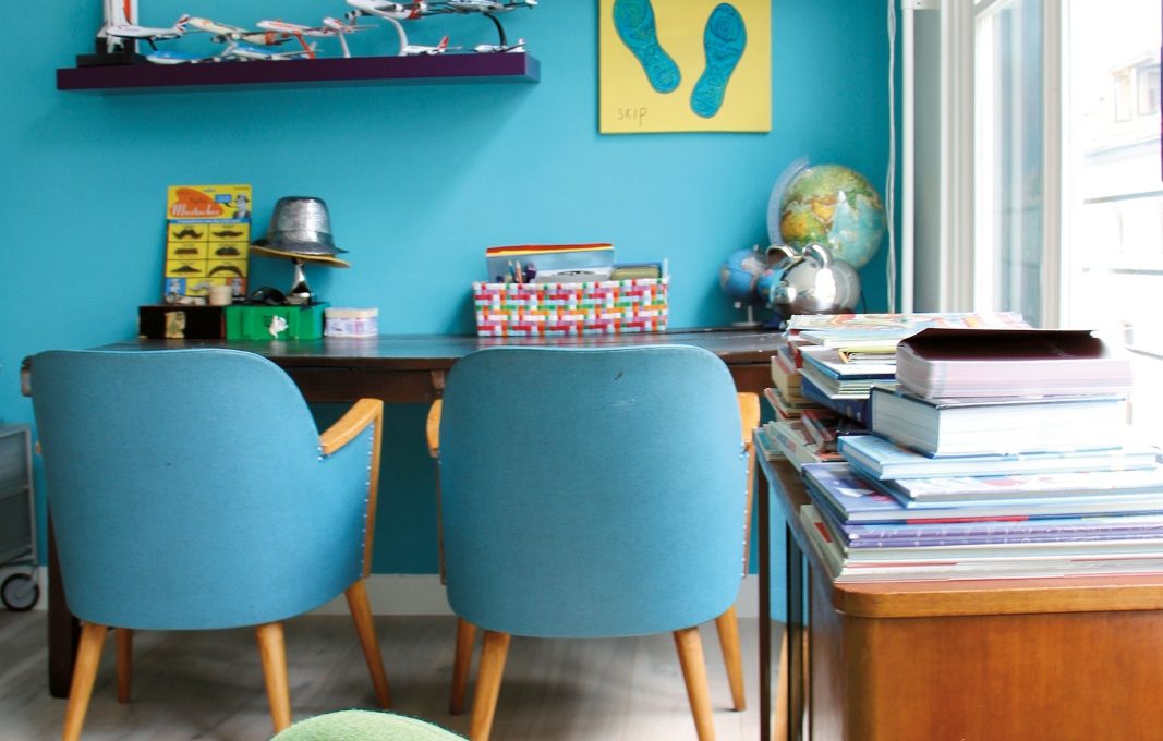 La parete del letto continua con la zona studio, che si trova accanto alla grande finestra. Due poltroncine vintage rendono confortevole quest’angolo, completato da 2 mensole (simili alle Lack di Ikea) dipinte di viola che ospitano modellini di aerei, videogames e giochi vari. I libri di scuola? Sono appoggiati su un piccolo comò in noce anni ’40.