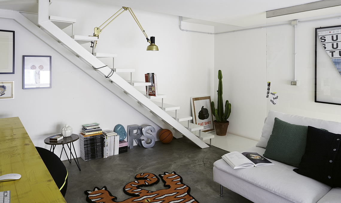 Una bella cucina grande per Stefano e Riccardo era imprescindibile, e le hanno dedicato il primo piano. Il soppalco perciò doveva servire da studio e da zona giorno: come farli convivere? «Abbiamo progettato una scrivania che non assomigliasse troppo… a una scrivania! Il piano è una lunga asse gialla da cantiere, non ha per niente l’aria seriosa e sta bene con l’angolo living. Dietro, una memory board taglia XL è utile e décor». Un tappeto pop sul pavimento in cemento, e lo stile è servito!