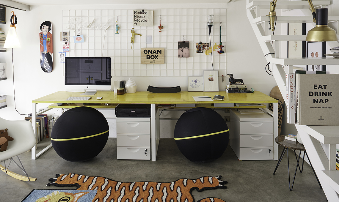 Le sedute Wellness ball Active Sitting [Technogym, ø cm 55 €245] sono un’idea furba per tenere in forma la muscolatura mentre lavori. Cassettiere [Ikea]; sulla scrivania, vassoio Putrella