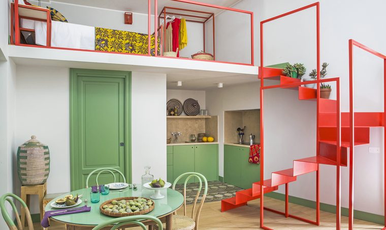 In una camera pensata per ospitare viaggiatori, anche gli arredi devono essere... veloci! Quindi, sì allo stender al posto dell’armadio, a una vecchia poltroncina da ufficio che fa