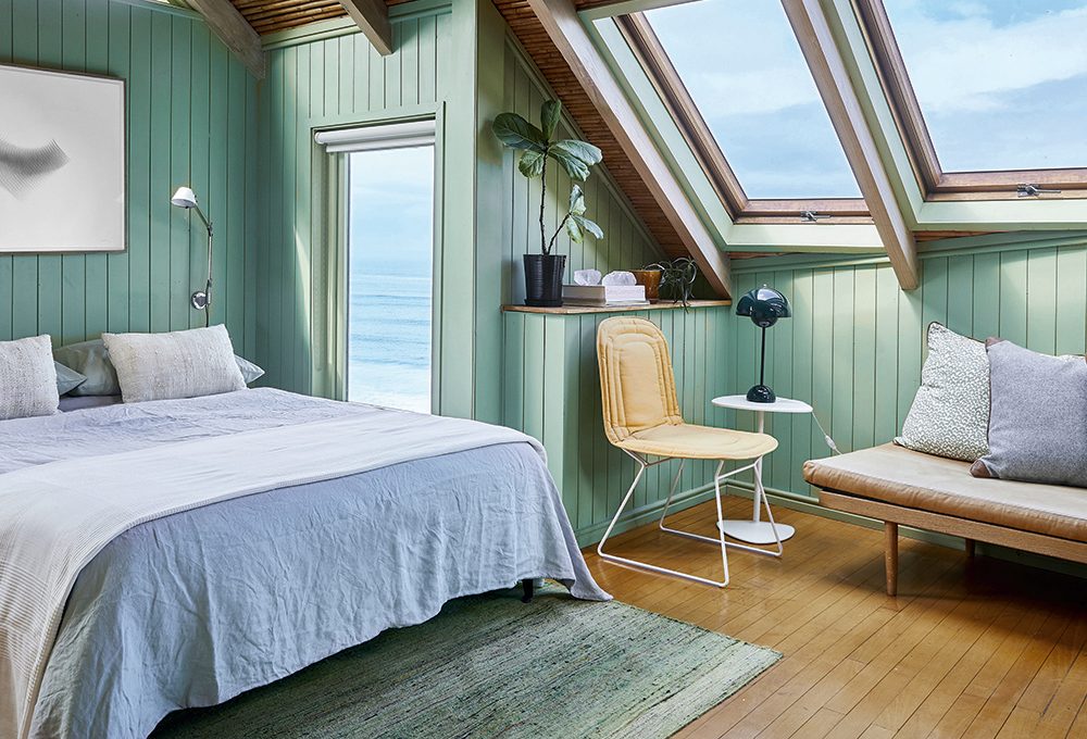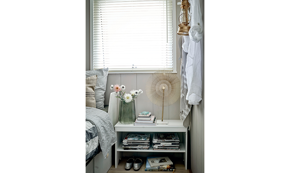 All’interno il tessile per il letto, cuscini e plaid. Hélène ha preferito mensole e scaffali realizzati con assi di recupero e ceste vintage in metallo.