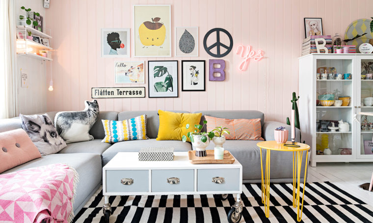 di grigio chiaro. Al posto delle scatole, vecchie ceste in rete di metallo rinfrescate con una mano di spray bianco.