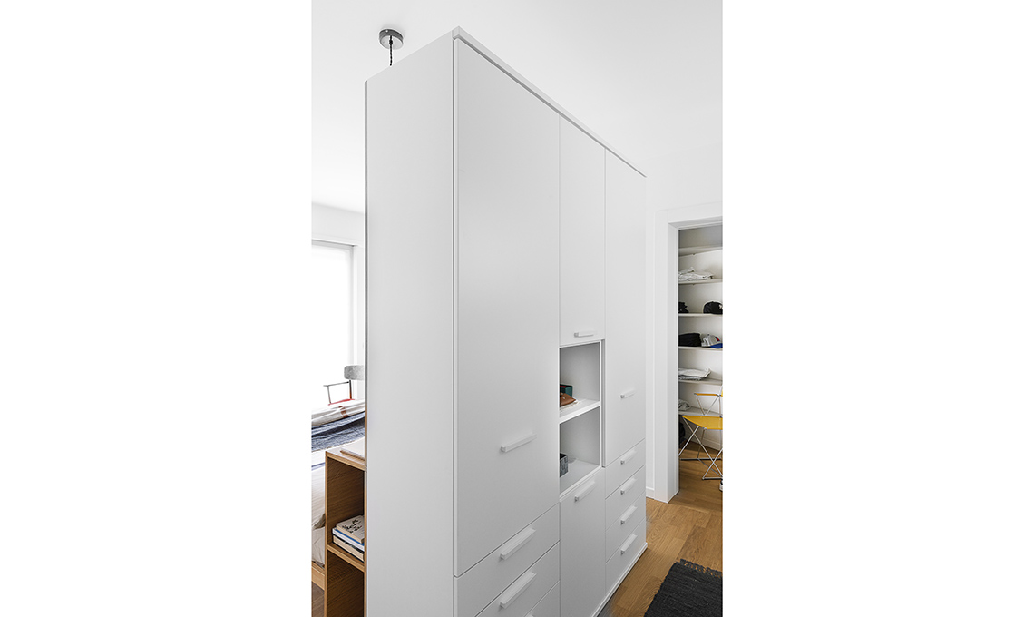 L’armadiatura sul retro della testata del letto crea un corridoio schermato che porta alla cabina armadio, ricavata nell’allargamento della struttura originaria della casa.